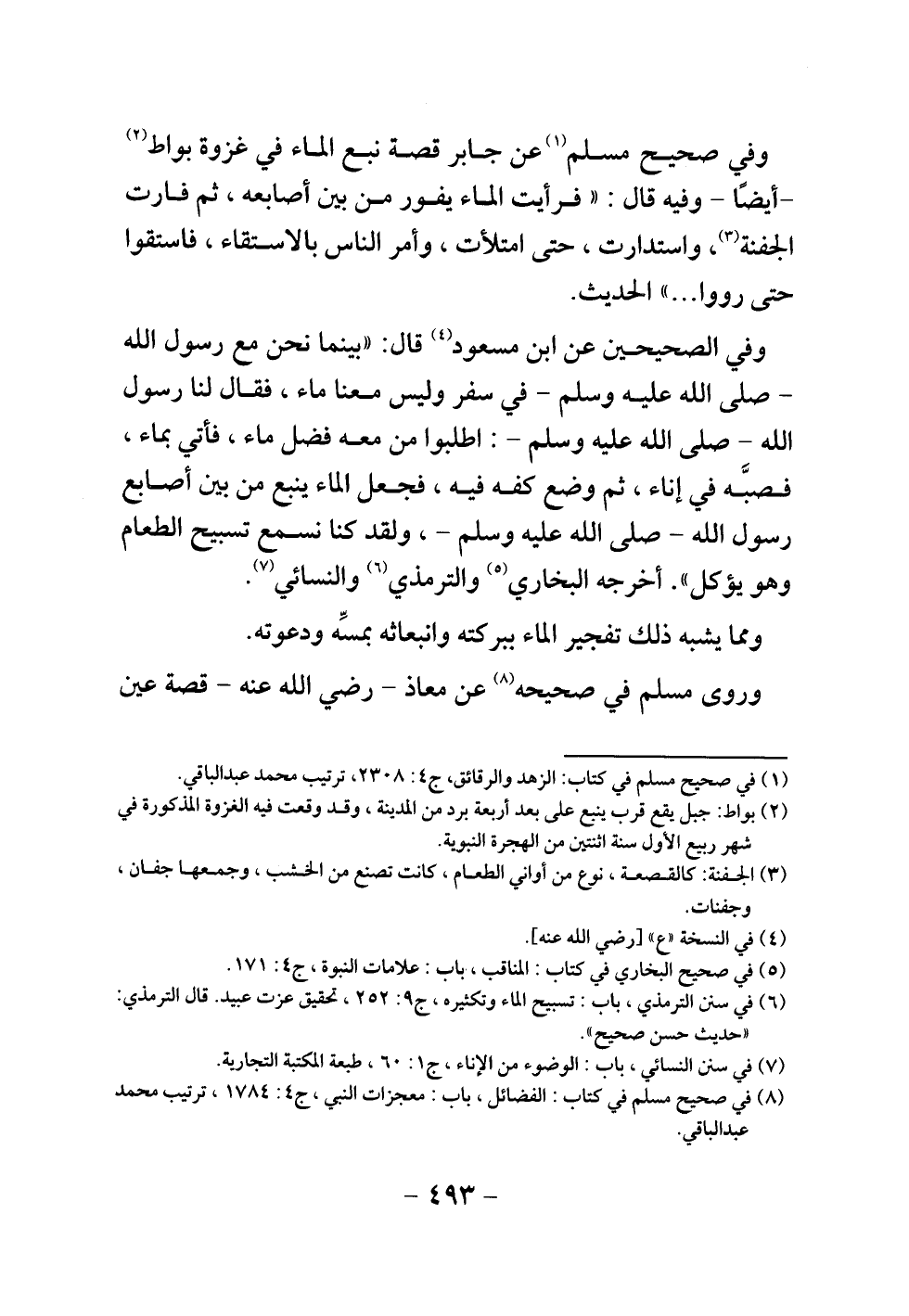 وفي صحيح مسلم عن جابر قصة نبع الماء في غزوة بواط - أيضا - وفيه قال: " «فرأيت الماء يفور من بين أصابعه، ثم فارت الجفنة، واستدارت، حتى امتلأت، وأمر الناس بالاستقاء، فاستقوا حتى رووا» ... " الحديث.
