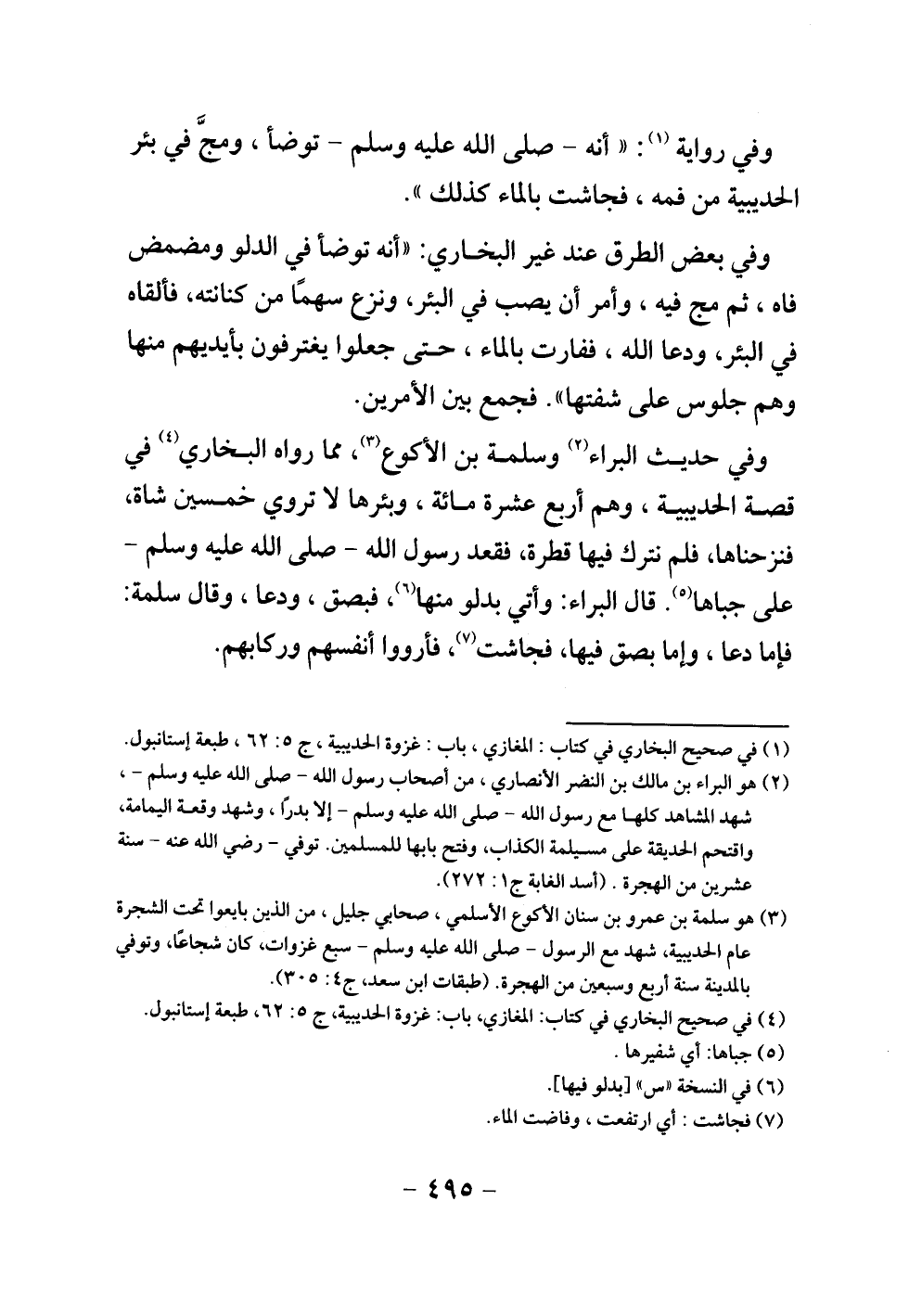 وفي حديث البراء وسلمة بن الأكوع، «مما رواه البخاري في قصة الحديبية، وهم أربع عشرة مائة، وبئرها لا تروي خمسين شاة، فنزحناها، فلم نترك فيها قطرة، فقعد رسول الله - صلى الله عليه وسلم - على جباها. قال البراء: وأتي بدلو منها، فبصق، ودعا - وقال سلمة: فإما دعا، وإما بصق فيها - فجاشت، فأرووا أنفسهم وركابهم» .