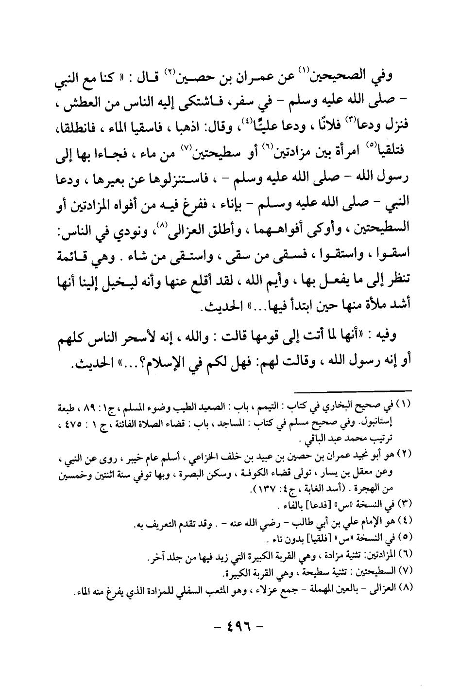 وفي الصحيحين عن عمران بن حصين قال: " «كنا مع النبي - صلى الله عليه وسلم - في سفر، فاشتكى إليه الناس من العطش، فنزل ودعا فلانا، ودعا عليا، وقال: اذهبا، فاسقيا الماء، فانطلقا، فتلقيا امرأة بين مزادتين أو سطيحتين من ماء، فجاءا بها إلى رسول الله - صلى الله عليه وسلم - فاستنزلوها عن بعيرها، ودعا النبي - صلى الله عليه وسلم - بإناء، ففرغ فيه من أفواه المزادتين أو السطيحتين، وأوكى أفواههما، وأطلق العزالى، ونودي في الناس: اسقوا، واستقوا، فسقى من سقى، واستقى من شاء. وهي قائمة تنظر إلى ما يفعل بها، وأيم الله، لقد أقلع عنها وأنه ليخيل إلينا أنها أشد ملأة منها حين ابتدأ فيها» .... " الحديث.