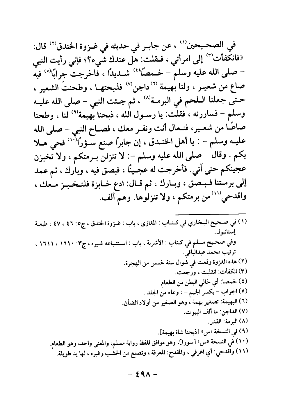 في الصحيحين عن جابر في حديثه في غزوة الخندق قال: " «فانكفأت إلى أمرأتي، فقلت: هل عندك شيء؟ فإني رأيت النبي - صلى الله عليه وسلم - خمصا شديدا، فأخرجت جرابا فيه صاع من شعير، ولنا بهيمة داجن فذبحتها، وطحنت الشعير حتى جعلنا اللحم في البرمة، ثم جئت النبي - صلى الله عليه وسلم - فساررته، فقلت: يا رسول الله ذبحنا بهيمة لنا، وطحنا صاعا من شعير، فتعال أنت ونفر معك، فصاح النبي - صلى الله عليه وسلم -: يا أهل الخندق إن جابرا صنع سؤرا فحي هلا بكم. وقال - صلى الله عليه وسلم -: لا تنزلن برمتكم، ولا تخبزن عجينكم حتى آتي، فأخرجت له عجينا. فبصق فيه، وبارك، ثم عمد إلى برمتنا فبصق، وبارك وثم قال: ادع خابزة فلتخبز معك، واقدحي من برمتكم، ولا تنزلوها. وهم ألف.