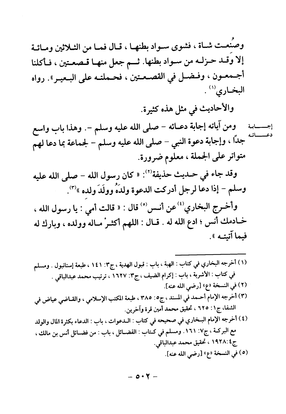 ومن آياته إجابة دعائه - صلى الله عليه وسلم - وهذا باب واسع جدا، وإجابة دعوة النبي - صلى الله عليه وسلم - لجماعة بما دعا لهم متواتر على الجملة، معلوم ضرورة.