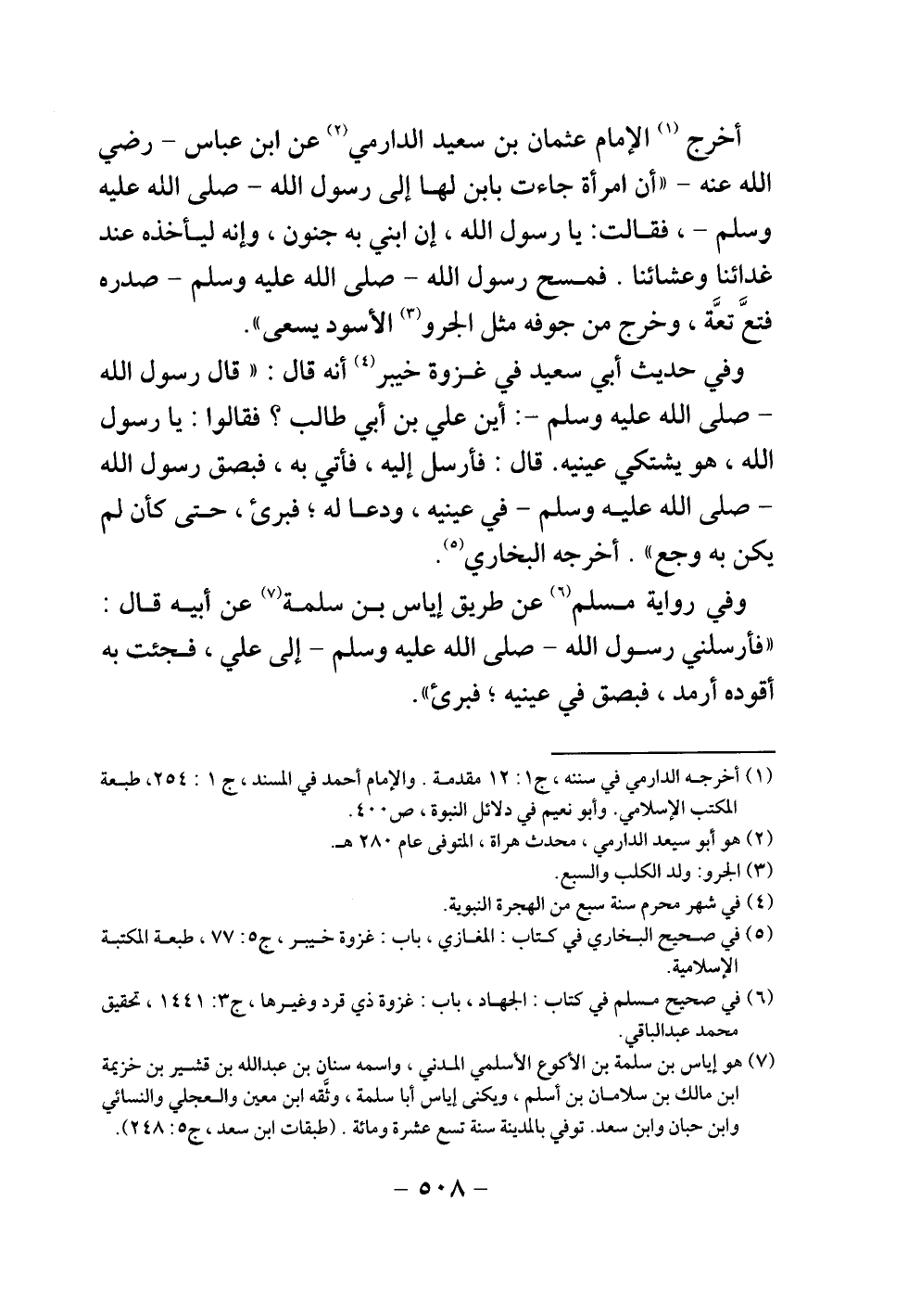 وفي رواية مسلم عن طريق إياس بن سلمة عن أبيه قال: " «فأرسلني رسول الله - صلى الله عليه وسلم - إلى علي، فجئت به أقوده أرمد، فبصق في عينيه، فبرئ» ".