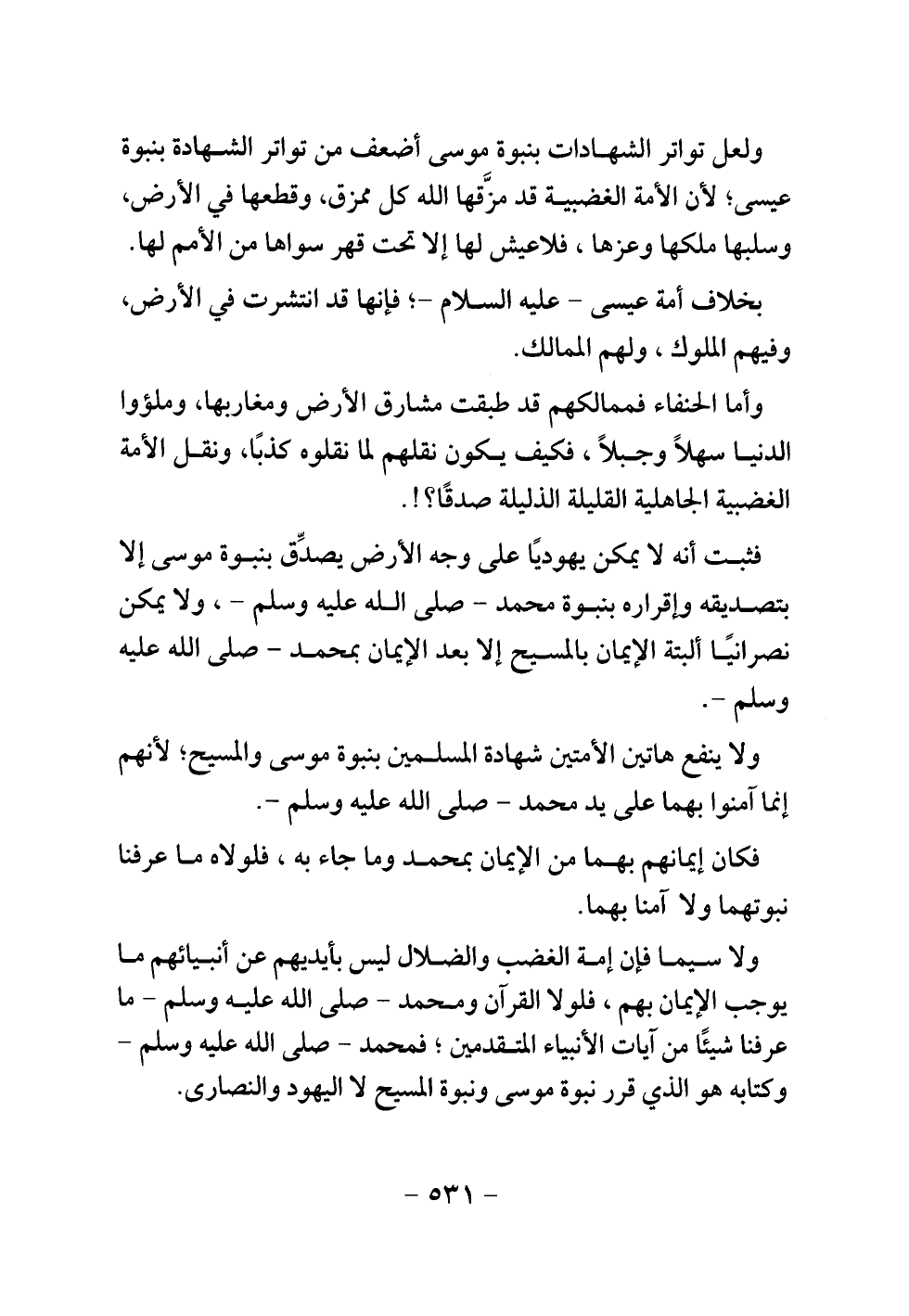 فثبت أنه لا يمكن يهوديا على وجه الأرض يصدق بنبوة موسى إلا بتصديقه وإقراره بنبوة محمد - صلى الله عليه وسلم - ولا يمكن نصرانيا ألبتة الإيمان بالمسيح إلا بعد الإيمان بمحمد صلى الله عليه وسلم.