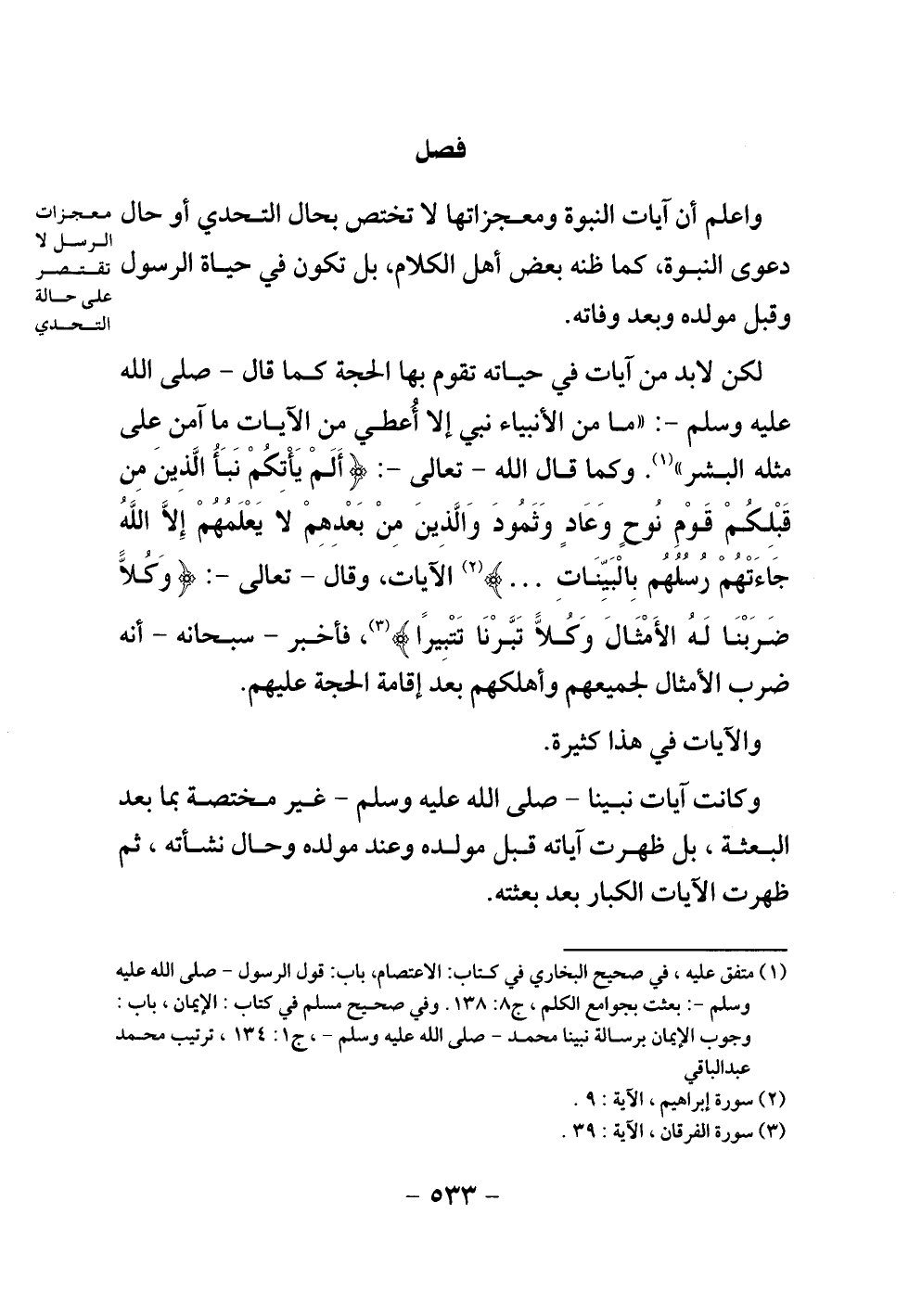 واعلم أن آيات النبوة ومعجزاتها لا تختص بحال التحدي أو حال دعوى النبوة، كما ظنه بعض أهل الكلام، بل تكون في حياة الرسول وقبل مولده وبعد وفاته.