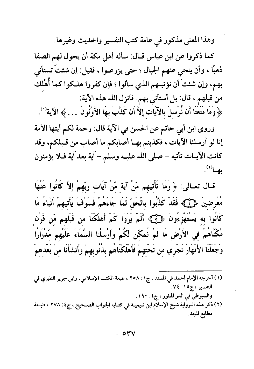 قال تعالى: {وَمَا تَأْتِيهِمْ مِنْ آيَةٍ مِنْ آيَاتِ رَبِّهِمْ إِلَّا كَانُوا عَنْهَا مُعْرِضِينَ فَقَدْ كَذَّبُوا بِالْحَقِّ لَمَّا جَاءَهُمْ فَسَوْفَ يَأْتِيهِمْ أَنْبَاءُ مَا كَانُوا بِهِ يَسْتَهْزِئُونَ أَلَمْ يَرَوْا كَمْ أَهْلَكْنَا مِنْ قَبْلِهِمْ مِنْ قَرْنٍ مَكَّنَّاهُمْ فِي الْأَرْضِ مَا لَمْ نُمَكِّنْ لَكُمْ وَأَرْسَلْنَا السَّمَاءَ عَلَيْهِمْ مِدْرَارًا وَجَعَلْنَا الْأَنْهَارَ تَجْرِي مِنْ تَحْتِهِمْ فَأَهْلَكْنَاهُمْ بِذُنُوبِهِمْ وَأَنْشَأْنَا مِنْ بَعْدِهِمْ قَرْنًا آخَرِينَ وَلَوْ نَزَّلْنَا عَلَيْكَ كِتَابًا فِي قِرْطَاسٍ فَلَمَسُوهُ بِأَيْدِيهِمْ لَقَالَ الَّذِينَ كَفَرُوا إِنْ هَذَا إِلَّا سِحْرٌ مُبِينٌ وَقَالُوا لَوْلَا أُنْزِلَ عَلَيْهِ مَلَكٌ وَلَوْ أَنْزَلْنَا مَلَكًا لَقُضِيَ الْأَمْرُ ثُمَّ لَا يُنْظَرُونَ وَلَوْ جَعَلْنَاهُ مَلَكًا لَجَعَلْنَاهُ رَجُلًا وَلَلَبَسْنَا عَلَيْهِمْ مَا يَلْبِسُونَ وَلَقَدِ اسْتُهْزِئَ بِرُسُلٍ مِنْ قَبْلِكَ فَحَاقَ بِالَّذِينَ سَخِرُوا مِنْهُمْ مَا كَانُوا بِهِ يَسْتَهْزِئُونَ قُلْ سِيرُوا فِي الْأَرْضِ ثُمَّ انْظُرُوا كَيْفَ كَانَ عَاقِبَةُ الْمُكَذِّبِينَ} .