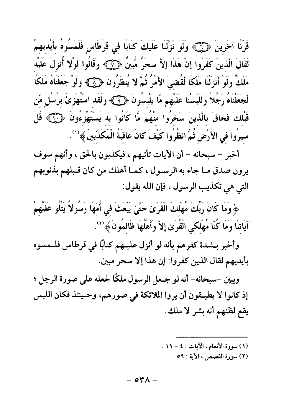 وأخبر بشدة كفرهم بأنه لو أنزل عليهم كتابا في قرطاس فلمسوه بأيديهم لقال الذين كفروا: إن هذا إلا سحر مبين.
