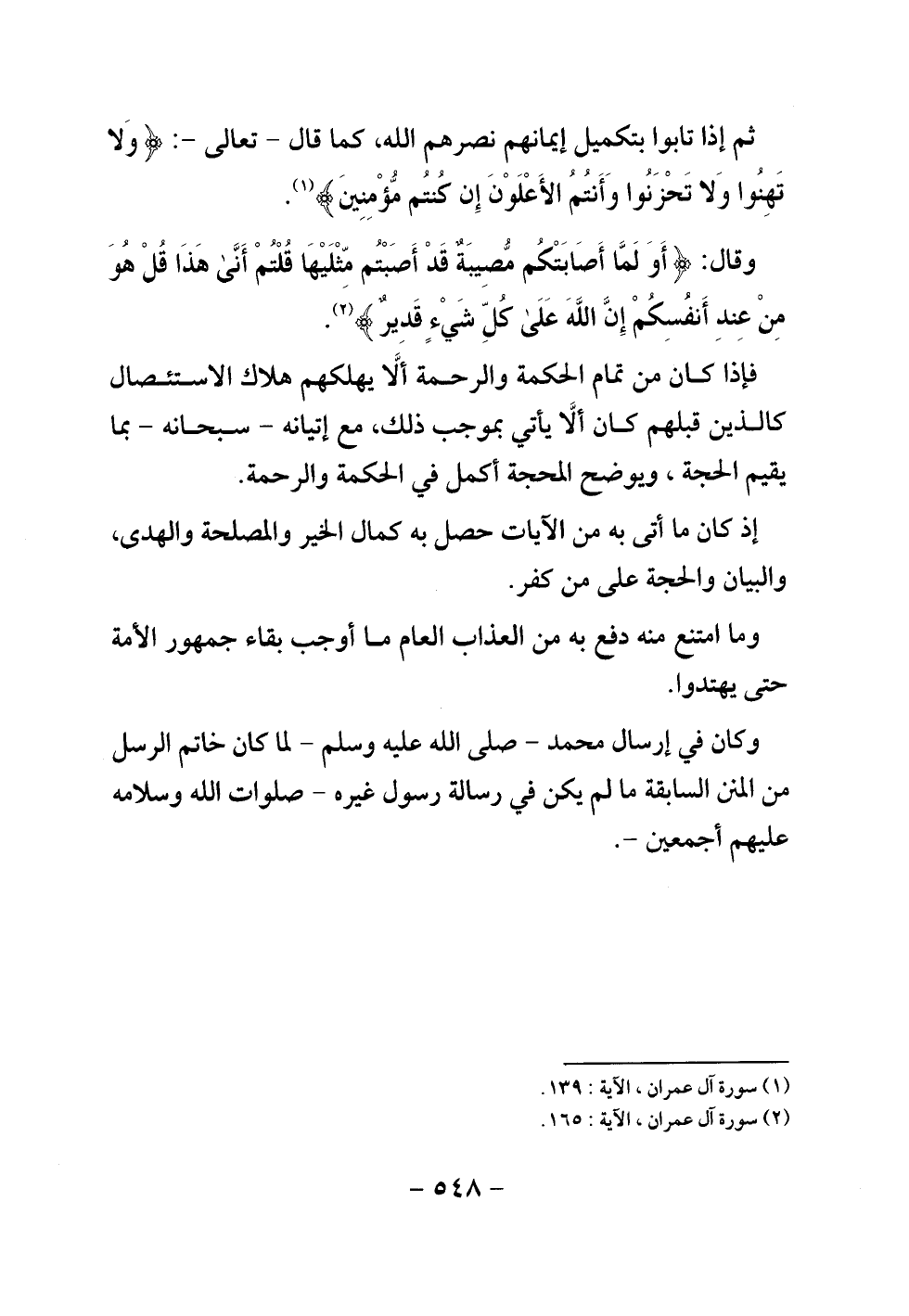 فإذا كان من تمام الحكمة والرحمة ألا يهلكهم هلاك الاستئصال كالذين قبلهم كان ألا يأتي بموجب ذلك، مع إتيانه - سبحانه - بما يقيم الحجة، ويوضح المحجة أكمل في الحكمة والرحمة.