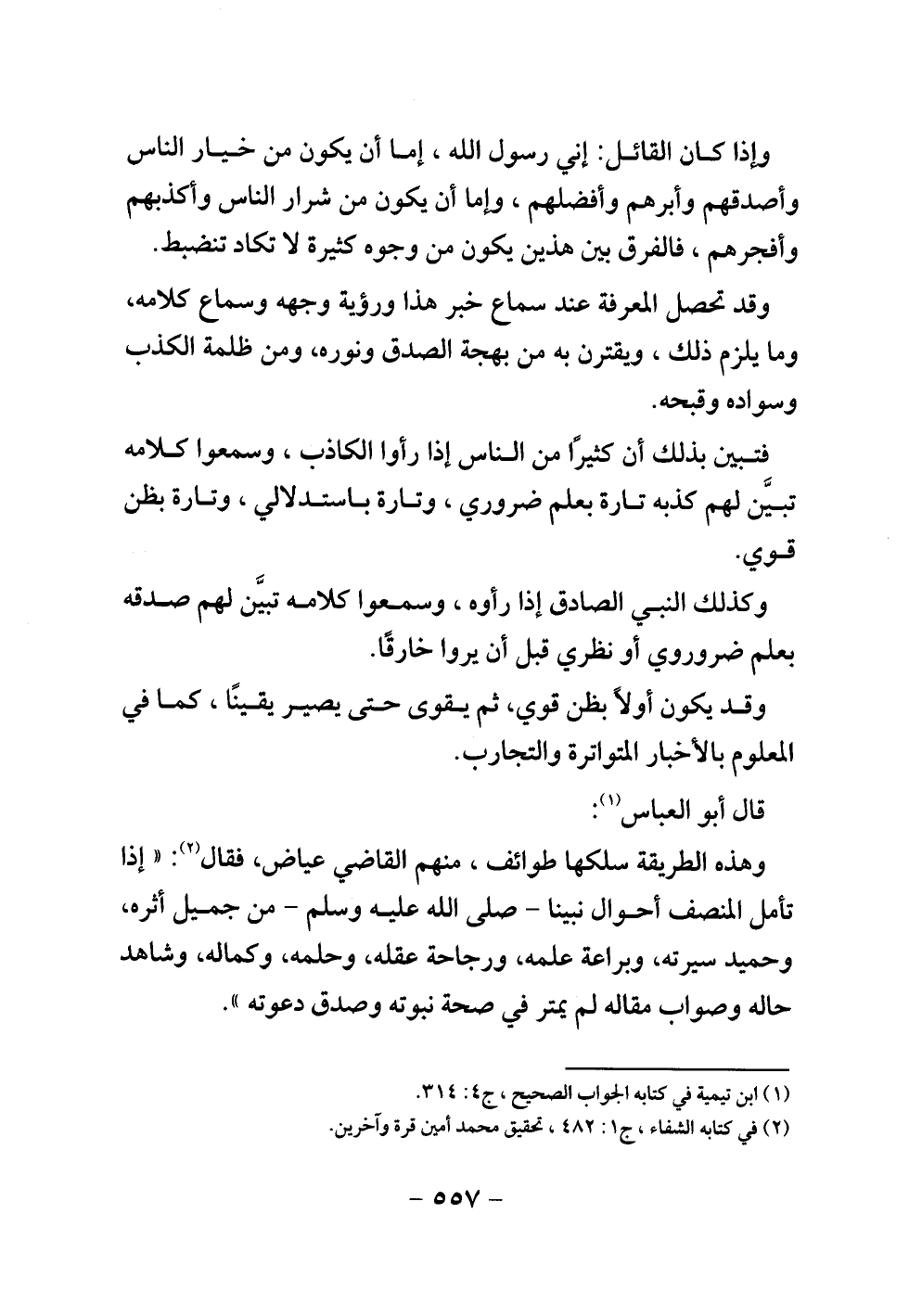 وهذه الطريقة سلكها طوائف، منهم القاضي عياض، فقال: " إذا تأمل المنصف أحوال نبينا - صلى الله عليه وسلم - من جميل أثره، وحميد سيرته، وبراعة علمه، ورجاحة عقله، وحلمه، وكماله، وشاهد حاله وصواب مقاله لم يمتر في صحة نبوته وصدق دعوته ".