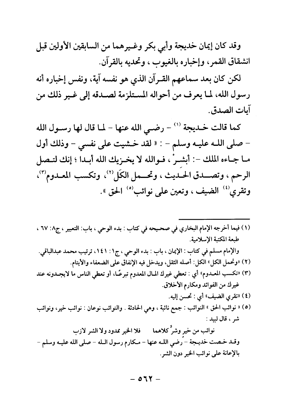 كما قالت خديجة - رضي الله عنها - لما قال لها رسول الله - صلى الله عليه وسلم -: " «لقد خشيت على نفسي» " وذلك أول ما جاءه الملك: أبشر، فو الله لا يخزيك الله أبدا، إنك لتصل الرحم، وتصدق الحديث، وتحمل الكل، وتكسب المعدوم، وتقري الضيف، وتعين على نوائب الحق ".