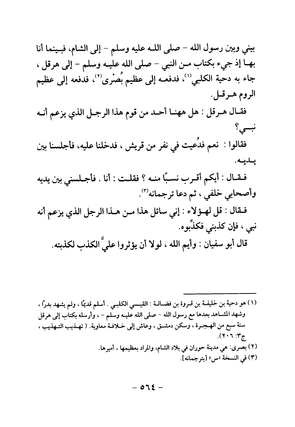 بيني وبين رسول الله - صلى الله عليه وسلم - إلى الشام، فبينما أنا بها إذ جيء بكتاب من النبي - صلى الله عليه وسلم - إلى هرقل، جاء به دحية الكلبي، فدفعه إلى عظيم بصرى، فدفعه إلى عظيم الروم هرقل.