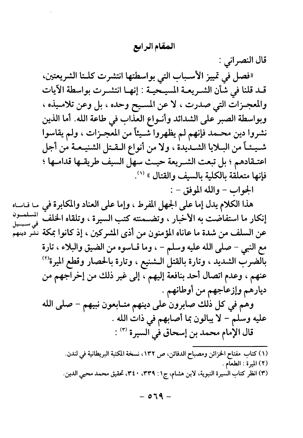" فصل في تمييز الأسباب التي بواسطتها انتشرت كلتا الشريعتين، قد قلنا في شأن الشريعة المسيحية: إنها انتشرت بواسطة الآيات والمعجزات التي صدرت، لا عن المسيح وحده، بل وعن تلاميذه، وبواسطة الصبر على الشدائد وأنواع العذاب في طاعة الله. أما الذين نشروا دين محمد فإنهم لم يظهروا شيئا من المعجزات، ولم يقاسوا شيئا من البلايا الشديدة، ولا من أنواع القتل الشنيعة من أجل اعتقادهم، بل تبعت الشريعة حيث سهل السيف طريقها قدامها، فإنها متعلقة بالكلية بالسيف والقتال ".