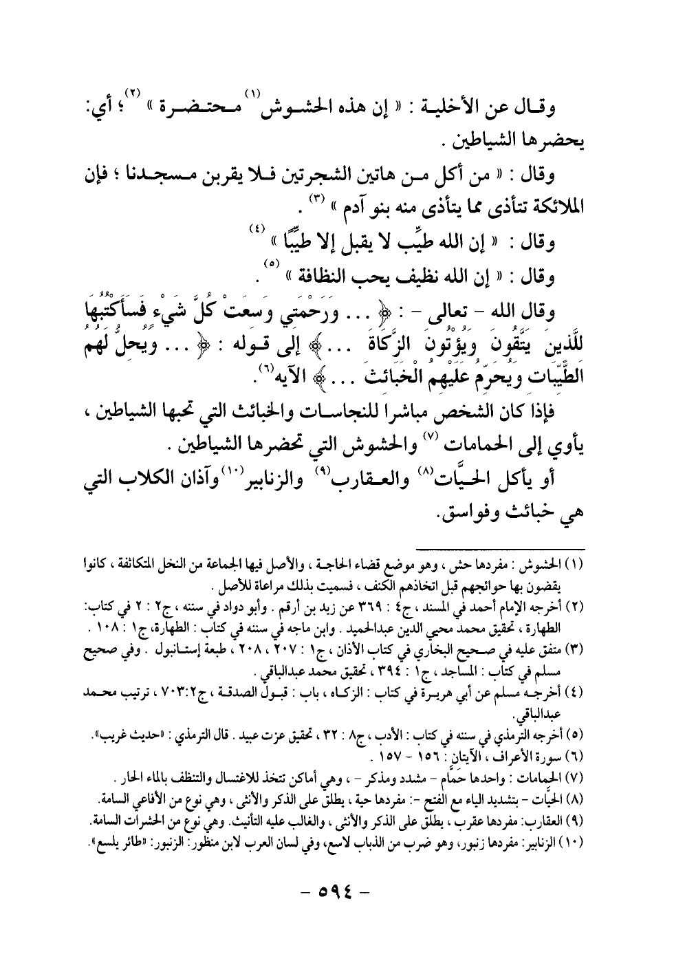وقال عن الأخلية: " «إن هذه الحشوش محتضرة» " أي: يحضرها الشياطين.