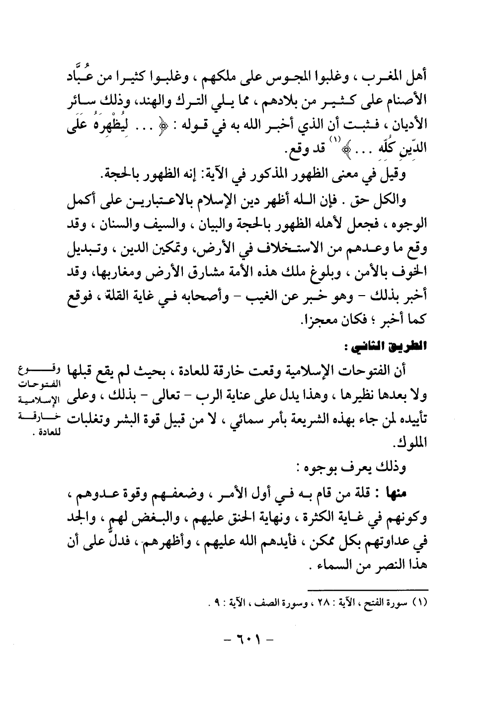 أن الفتوحات الإسلامية وقعت خارقة للعادة، بحيث لم يقع قبلها ولا بعدها نظيرها، وهذا يدل على عناية الرب - تعالى - بذلك، وعلى تأييده لمن جاء بهذه الشريعة بأمر سمائي، لا من قبيل قوة البشر وتغلبات الملوك.