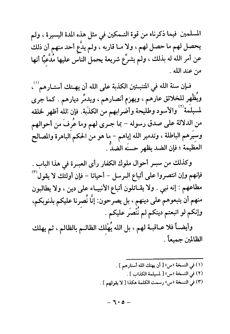 فإن سنة الله في المتنبئين الكذبة على الله أن يهتك أستارهم، ويظهر للخلائق عارهم، ويهزم أنصارهم، ويدمر ديارهم. كما جرى لمسيلمة والأسود وطليحة وأضرابهم من الكذبة. فإن الله أظهر لخلقه من الدلالة على صدق رسله - بما جرى لهم وما عرف من أحوالهم وسيرهم الباطلة، وتدمير الله إياهم - ما هو من الحكم الباهرة والمصالح العظيمة، فإن الضد يظهر حسنه الضد.