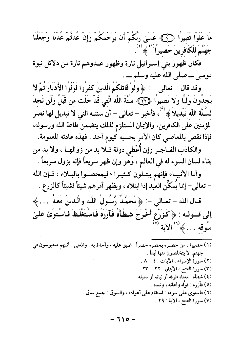 وقد قال - تعالى -: {وَلَوْ قَاتَلَكُمُ الَّذِينَ كَفَرُوا لَوَلَّوُا الْأَدْبَارَ ثُمَّ لَا يَجِدُونَ وَلِيًّا وَلَا نَصِيرًا سُنَّةَ اللَّهِ الَّتِي قَدْ خَلَتْ مِنْ قَبْلُ وَلَنْ تَجِدَ لِسُنَّةِ اللَّهِ تَبْدِيلًا} فأخبر - تعالى - أن سنته التي لا تبديل لها نصر المؤمنين على الكافرين، والإيمان المستلزم لذلك يتضمن طاعة الله ورسوله، فإذا نقص بالمعاصي كان الأمر بحسبه، كيوم أحد. فهذه عادته المعلومة.
