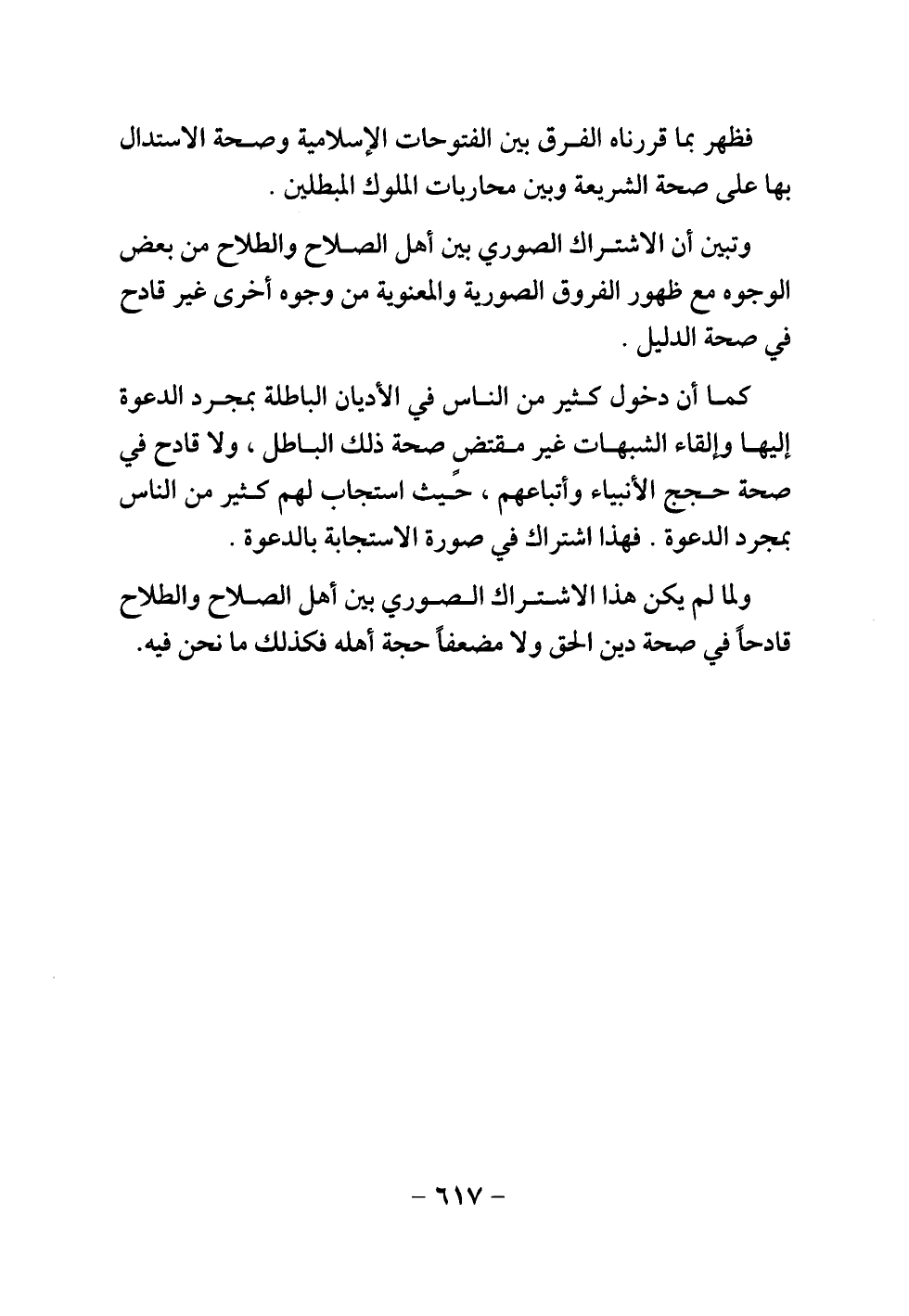 ولما لم يكن هذا الاشتراك الصوري بين أهل الصلاح والطلاح قادحا في صحة دين الحق ولا مضعفا حجة أهله، فكذلك ما نحن فيه.