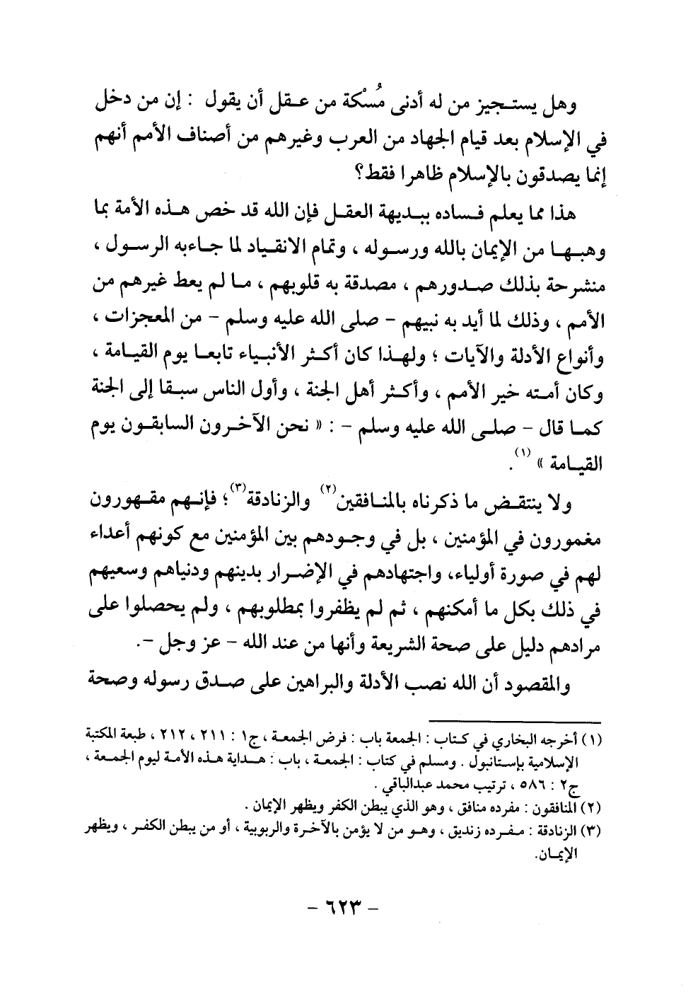 ولا ينتقض ما ذكرناه بالمنافقين والزنادقة، فإنهم مقهورون مغمورون في المؤمنين، بل في وجودهم بين المؤمنين مع كونهم أعداء لهم في صورة أولياء، واجتهادهم في الإضرار بدينهم ودنياهم وسعيهم في ذلك بكل ما أمكنهم، ثم لم يظفروا بمطلوبهم، ولم يحصلوا على مرادهم دليل على صحة الشريعة وأنها من عند الله عز وجل.