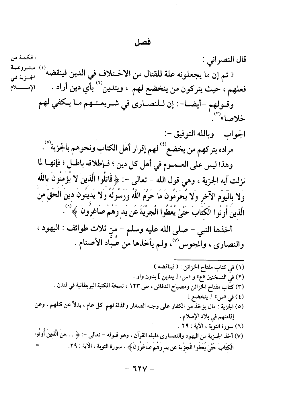 وهذا ليس على العموم في أهل كل دين، فإطلاقه باطل، فإنها لما نزلت آية الجزية، وهي قول الله - تعالى -: {قَاتِلُوا الَّذِينَ لَا يُؤْمِنُونَ بِاللَّهِ وَلَا بِالْيَوْمِ الْآخِرِ وَلَا يُحَرِّمُونَ مَا حَرَّمَ اللَّهُ وَرَسُولُهُ وَلَا يَدِينُونَ دِينَ الْحَقِّ مِنَ الَّذِينَ أُوتُوا الْكِتَابَ حَتَّى يُعْطُوا الْجِزْيَةَ عَنْ يَدٍ وَهُمْ صَاغِرُونَ} .