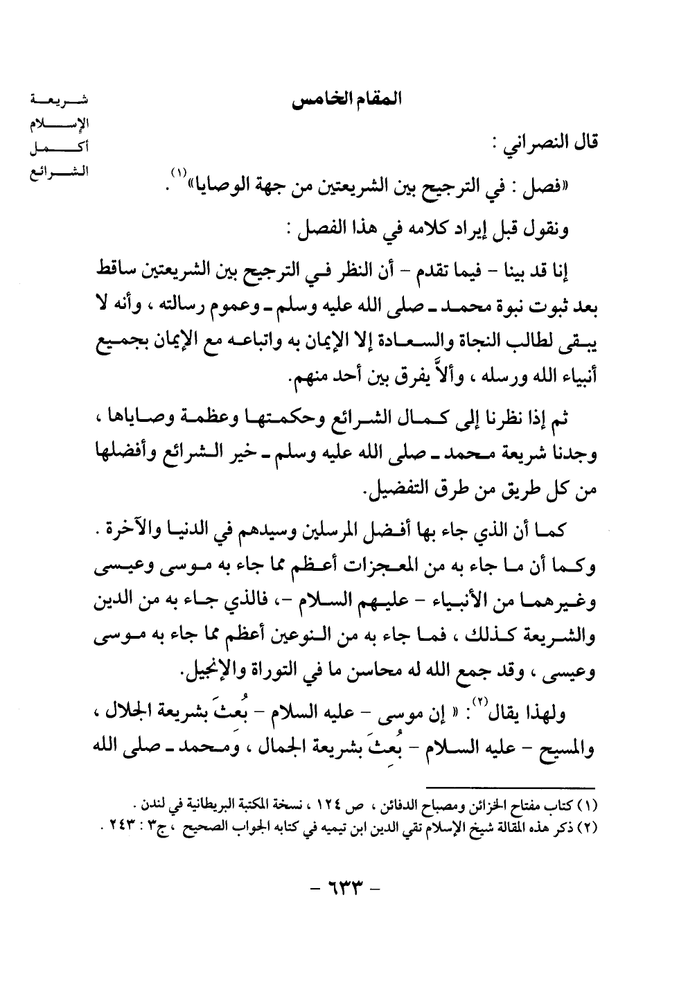 ثم إذا نظرنا إلى كمال الشرائع وحكمتها وعظمة وصاياها، وجدنا شريعة محمد - صلى الله عليه وسلم - خير الشرائع وأفضلها من كل طريق من طرق التفضيل.