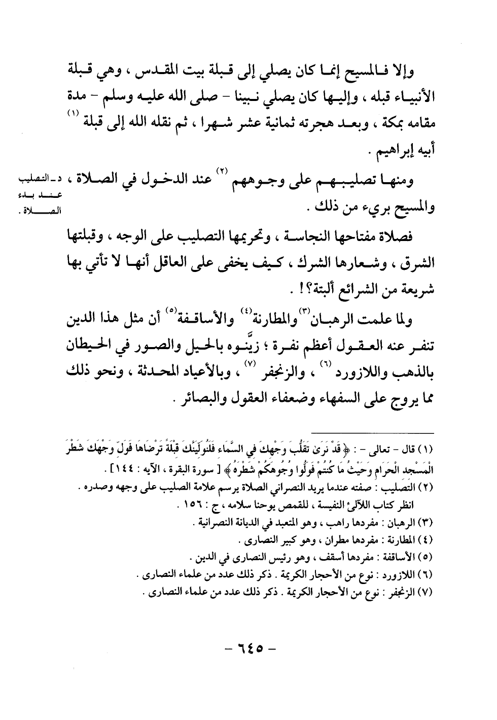 فصلاة مفتاحها النجاسة، وتحريمها التصليب على الوجه، وقبلتها الشرق، وشعارها الشرك، كيف يخفى على العاقل أنها لا تأتي بها شريعة من الشرائع ألبتة؟.