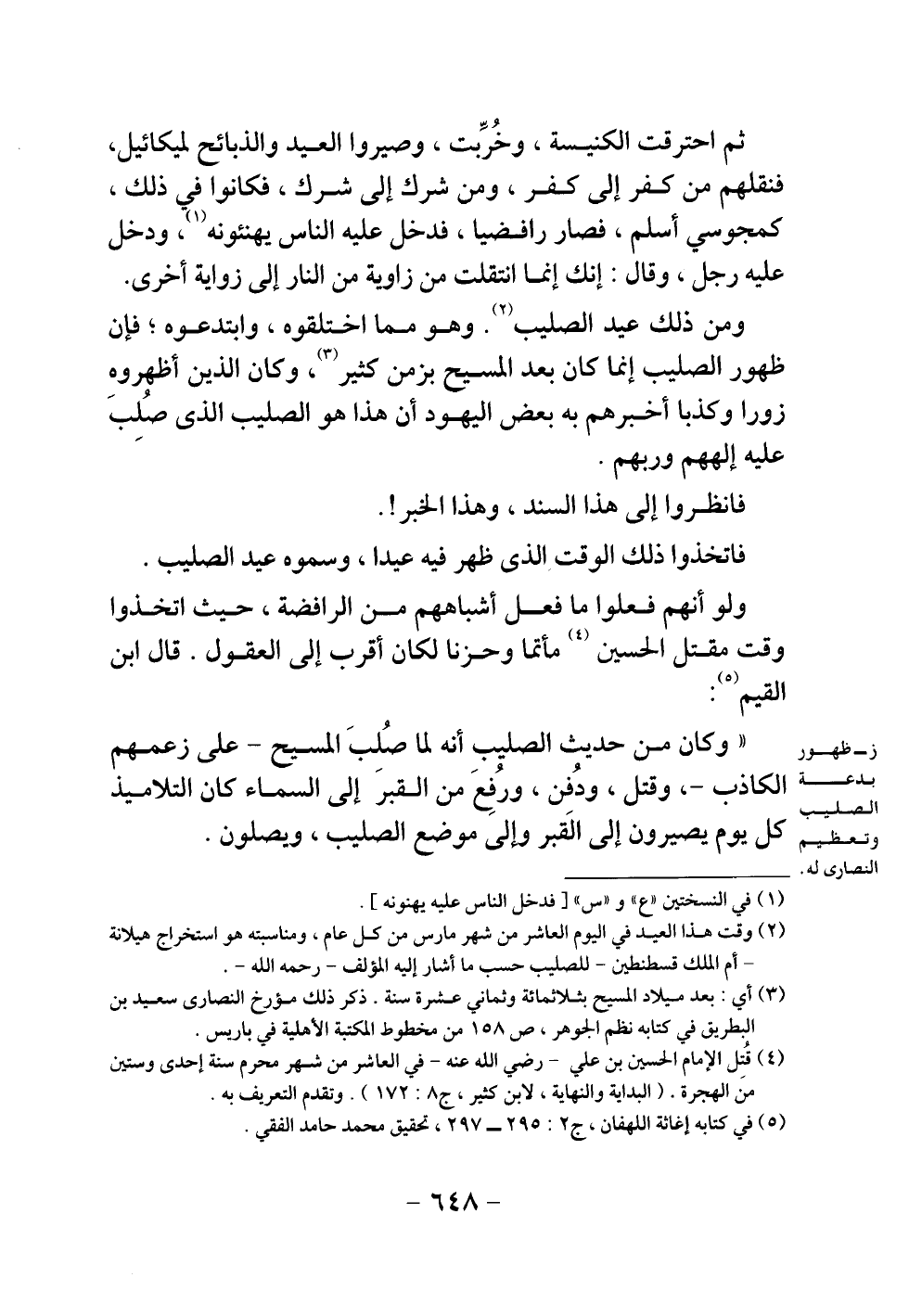 ولو أنهم فعلوا ما فعل أشباههم من الرافضة، حيث اتخذوا وقت مقتل الحسين مأتما وحزنا لكان أقرب إلى العقول. قال ابن القيم: