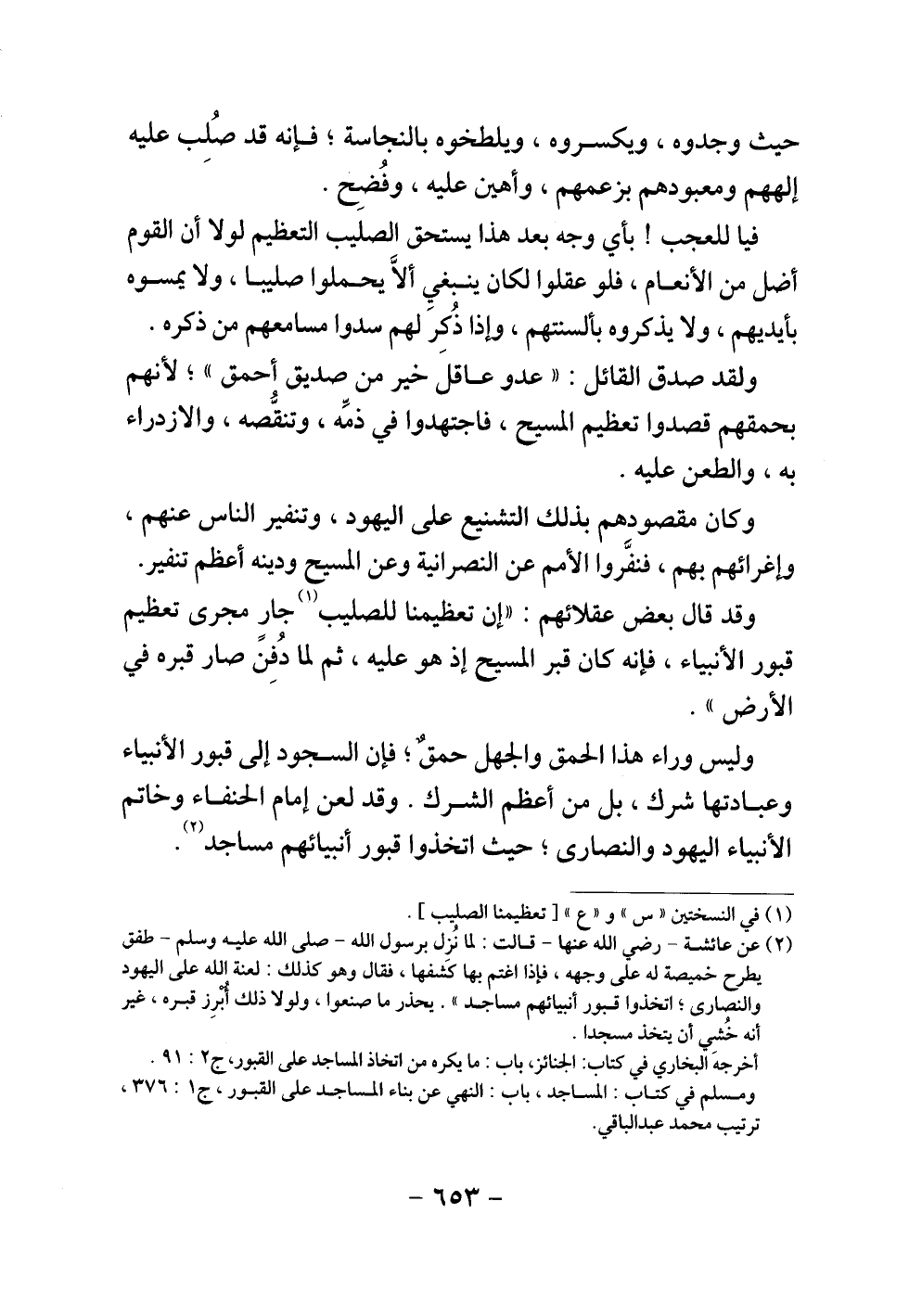 وليس وراء هذا الحمق والجهل حمق، فإن السجود إلى قبور الأنبياء وعبادتها شرك، بل من أعظم الشرك. وقد لعن إمام الحنفاء وخاتم الأنبياء اليهود والنصارى، حيث اتخذوا قبور أنبيائهم مساجد.