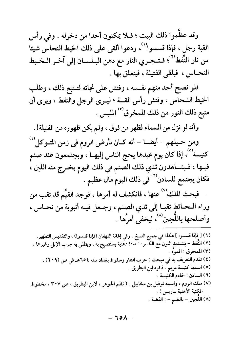 فلو نصح أحد منهم نفسه، وفتش على نجاته لتتبع ذلك، وطلب الخيط النحاس، وفتش رأس القبة، ليرى الرجل والنفط، ويرى أن منبع ذلك النور من ذلك الممخرق الملبس.