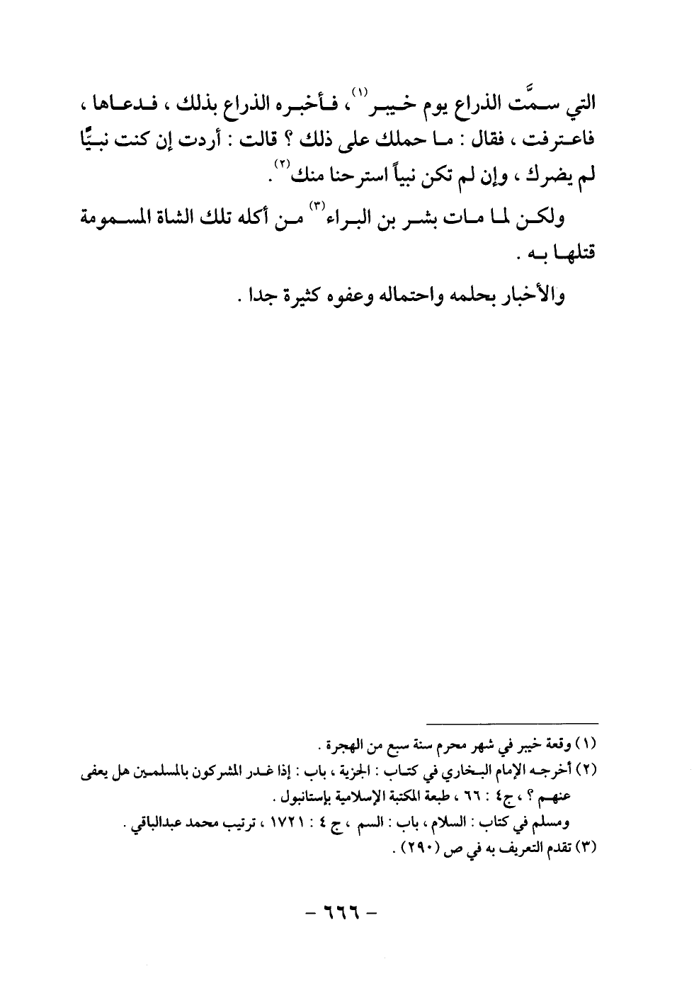 التي سمت الذراع يوم خبير، فأخبره الذراع بذلك، فدعاها، فاعترفت، فقال: ما حملك على ذلك؟ قالت: أردت إن كنت نبيا لم يضرك، وإن لم تكن نبيا استرحنا منك.