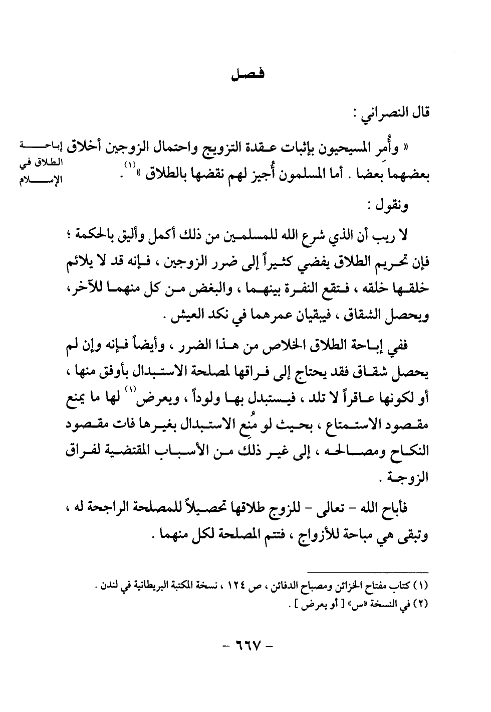 " وأمر المسيحيون بإثبات عقدة التزويج واحتمال الزوجين أخلاق بعضهما بعضا. أما المسلمون أجيز لهم نقضها بالطلاق ".