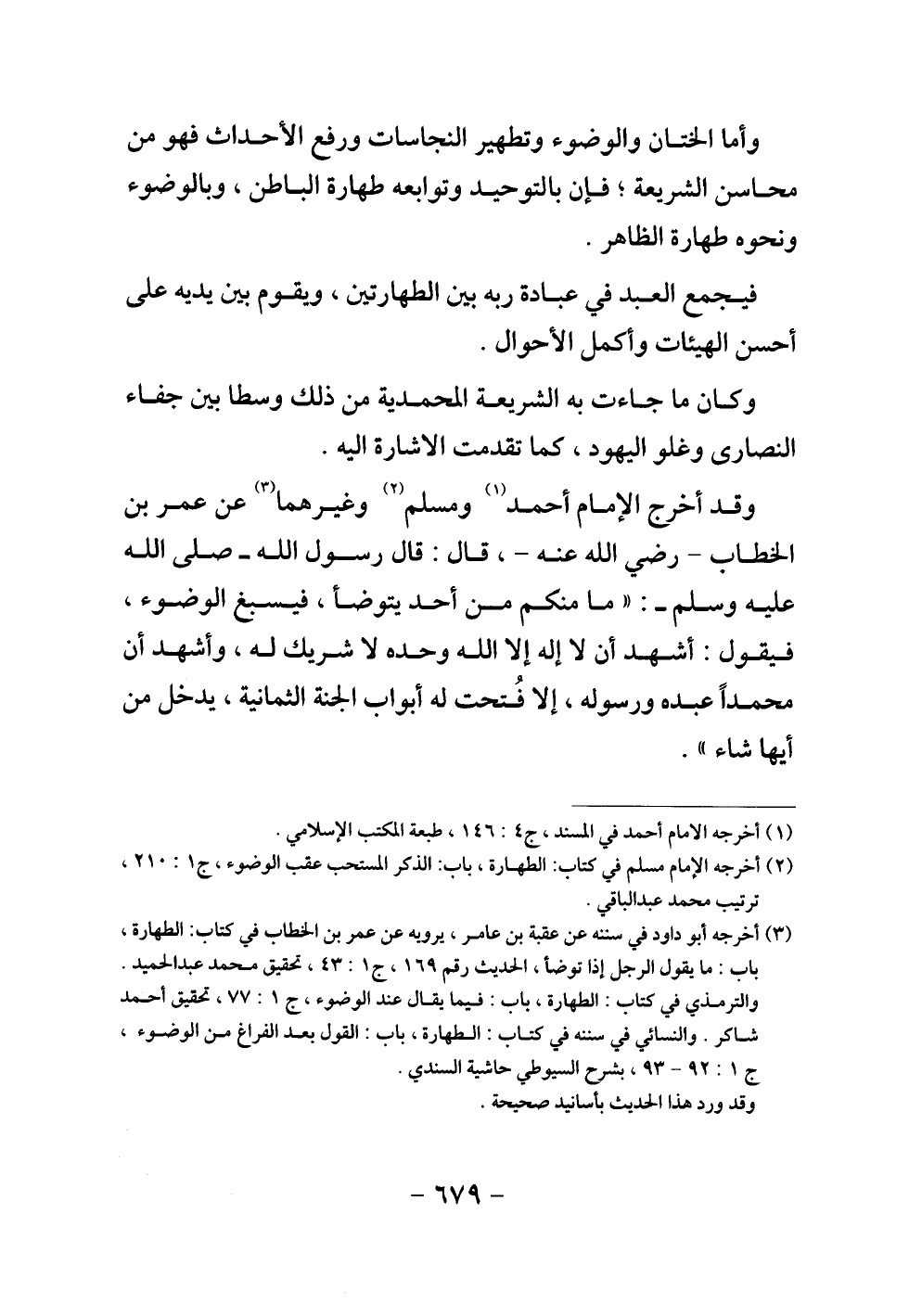 وقد أخرج الإمام أحمد ومسلم وغيرهما عن عمر بن الخطاب - رضي الله عنه - قال: قال رسول الله - صلى الله عليه وسلم -: " «ما منكم من أحد يتوضأ، فيسبغ الوضوء، فيقول: أشهد أن لا إله إلا الله وحده لا شريك له، وأشهد أن محمدا عبده ورسوله، إلا فتحت له أبواب الجنة الثمانية، يدخل من أيها شاء» ".