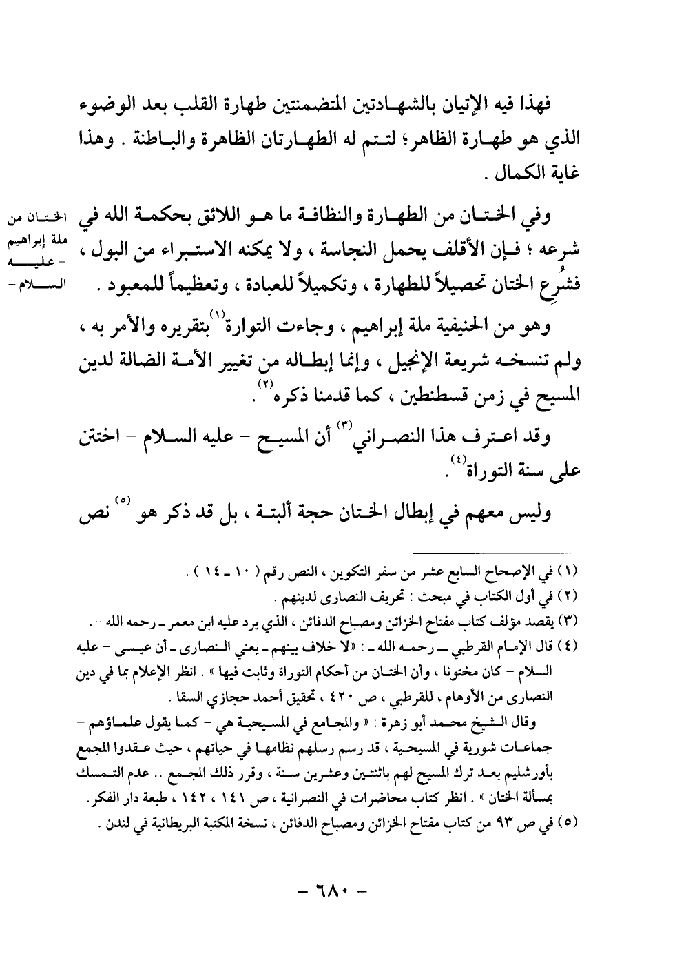 وهو من الحنفية ملة إبراهيم، وجاءت التوراة بتقريره والأمر به، ولم تنسخه شريعة الإنجيل، وإنما إبطاله من تغيير الأمة الضالة لدين المسيح في زمن قسطنطين، كما قدمنا ذكره.