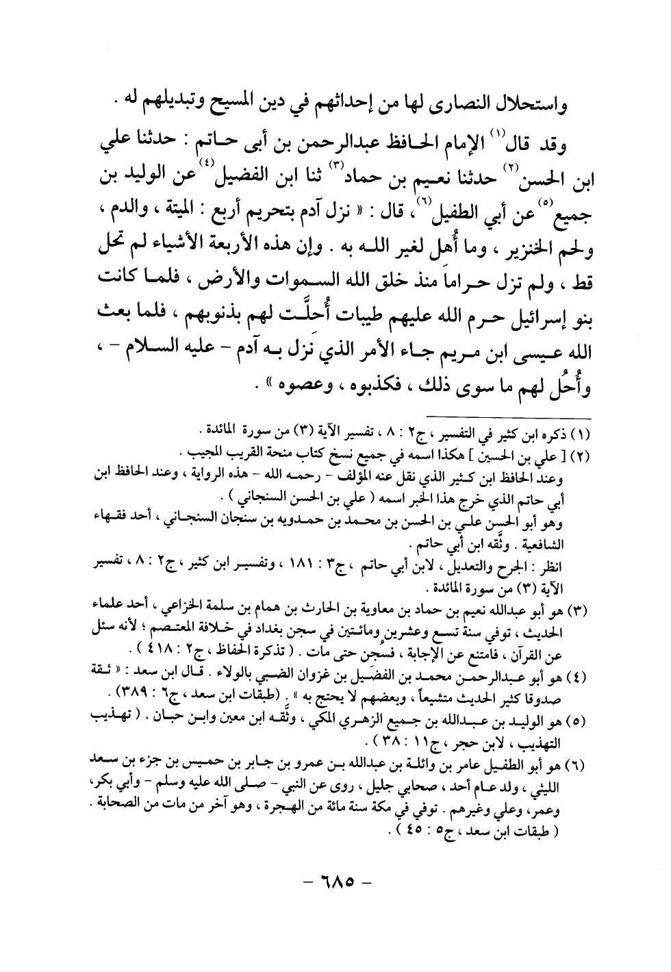 وقد قال الإمام الحافظ عبد الرحمن بن أبي حاتم: حدثنا علي بن الحسن حدثنا نعيم بن حماد ثنا ابن الفضيل عن الوليد بن جميع عن أبي الطفيل، قال: " نزل آدم بتحريم أربع: الميتة والدم ولحم الخنزير، وما أهل لغير الله به. وإن هذه الأربعة الأشياء لم تحل قط، ولم تزل حراما منذ خلق الله السموات والأرض، فلما بعث الله عيسى ابن مريم جاء الأمر الذي نزل به آدم - عليه السلام - وأحل لهم ما سوى ذلك، فكذبوه، وعصوه ".