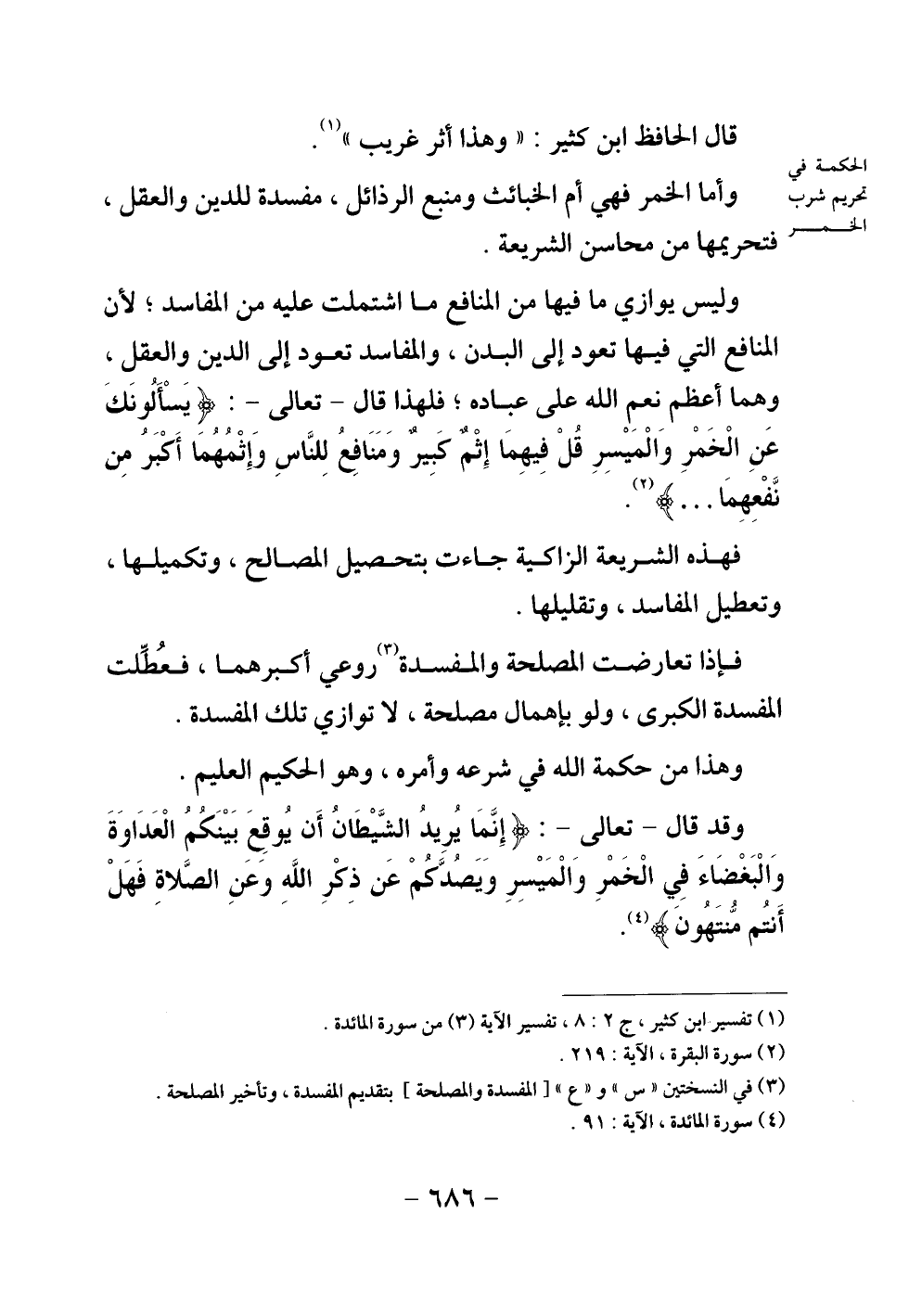 وليس يوازي ما فيها من المنافع ما اشتملت عليه من المفاسد، لأن المنافع التي فيها تعود إلى البدن، والمفاسد تعود إلى الدين والعقل، وهما أعظم نعم الله على عباده، فلهذا قال - تعالى -: {يَسْأَلُونَكَ عَنِ الْخَمْرِ وَالْمَيْسِرِ قُلْ فِيهِمَا إِثْمٌ كَبِيرٌ وَمَنَافِعُ لِلنَّاسِ وَإِثْمُهُمَا أَكْبَرُ مِنْ نَفْعِهِمَا} .... .