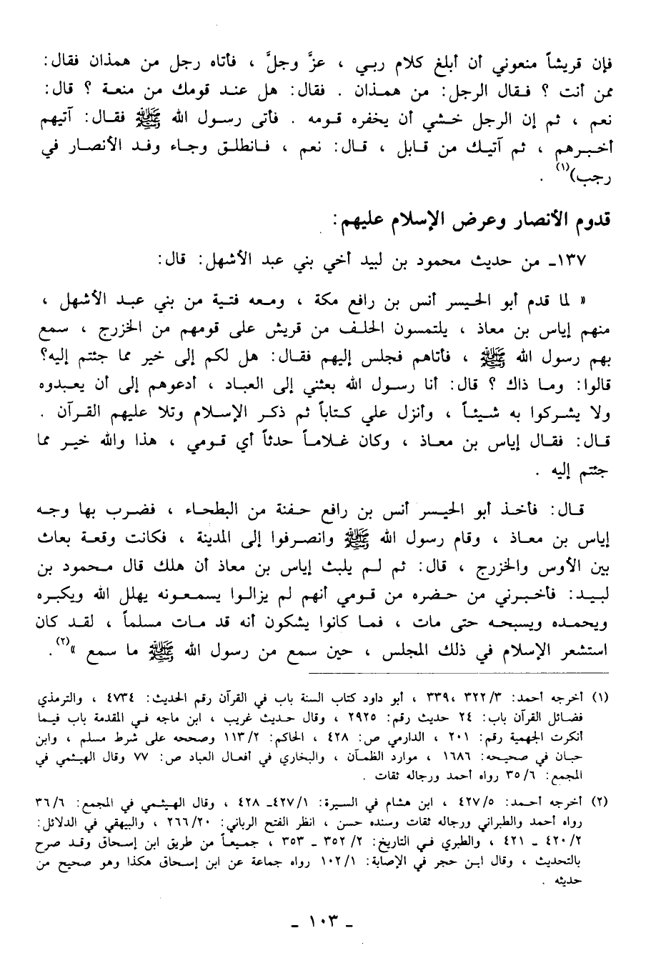 (¬2) أخرجه أحمد: 5/ 427، ابن هشام في السيرة: 1/ 427 , 428، وقال الهيثمي في المجمع: 6/ 36 رواه أحمد والطبراني ورجاله ثقات وسنده حسن، انظر الفتح الرباني: 20/ 266، والبيهقي في الدلائل: 2/ 420 - 421، والطبري في التاريخ: 2/ 352 - 353، جميعًا من طريق ابن إسحاق وقد صرح بالتحديث، وقال ابن حجر في الإصابة: 1/ 102 رواه جماعة عن ابن إسحاق هكذا وهو صحيح من حدثه.