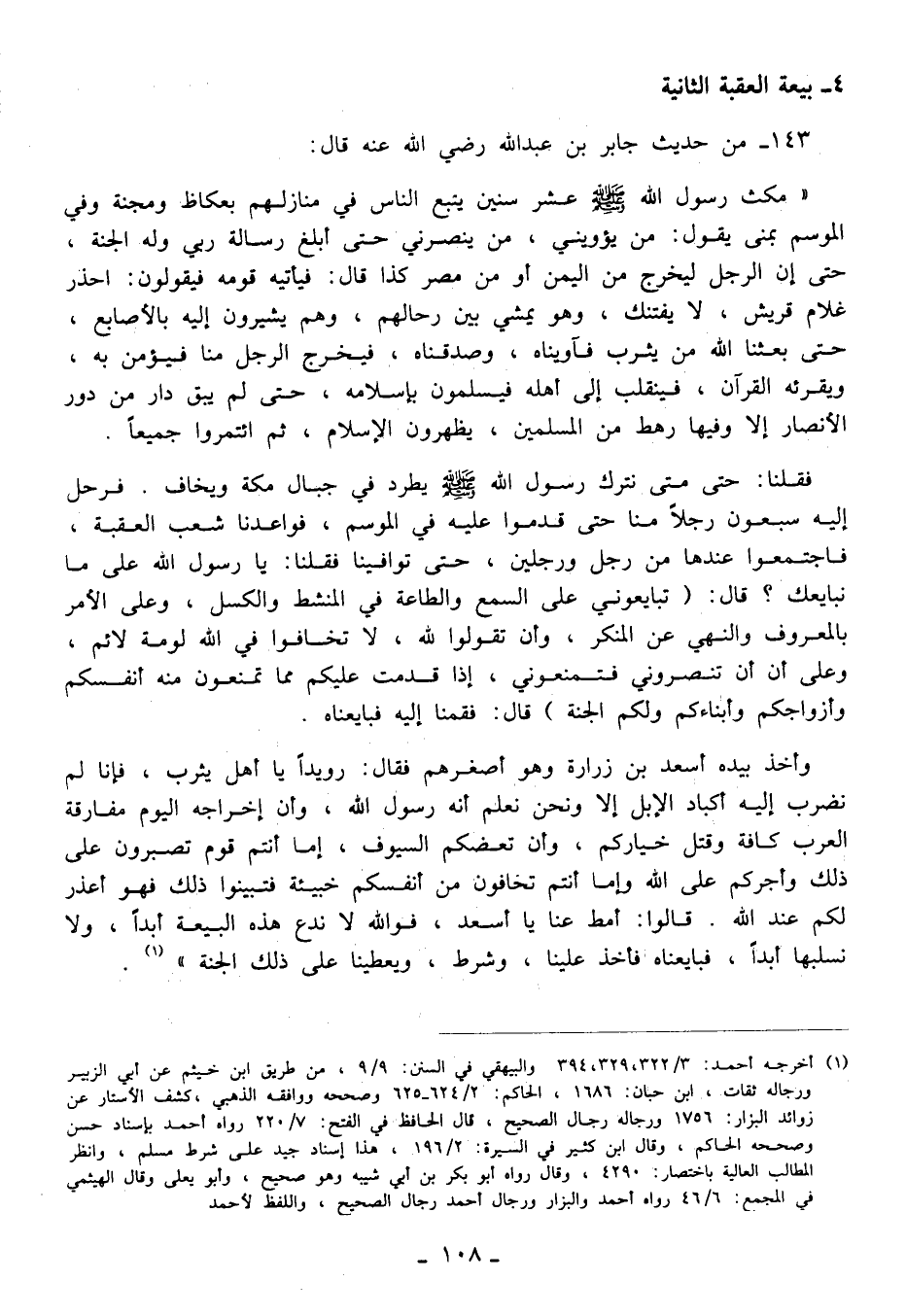 فقلنا: حتى متى نترك رسول الله - صلى الله عليه وسلم - يطرد في جبال مكة ويخاف. فرحل إليه سبعون رجلًا منا حتى قدموا عليه في الموسم، فواعدنا شعب العقبة، فاجتمعوا عندها من رجل ورجلين، حتى توافينا فقلنا: يا رسول الله على ما نبايعك؟ قال: (تبايعوني على السمع والطاعة في المنشط والكسل، وعلى الأمر بالمعروف والنهي عن المنكر، وأن تقولوا لله، لا تخافوا في الله لومة لائم، وعلى أن أن تنصروني فتمنعوني، إذا قدمت عليكم مما تمنعون منه أنفسكم وأزواجكم وأبناءكم ولكم الجنة) قال: فقمنا إليه فبايعناه.
