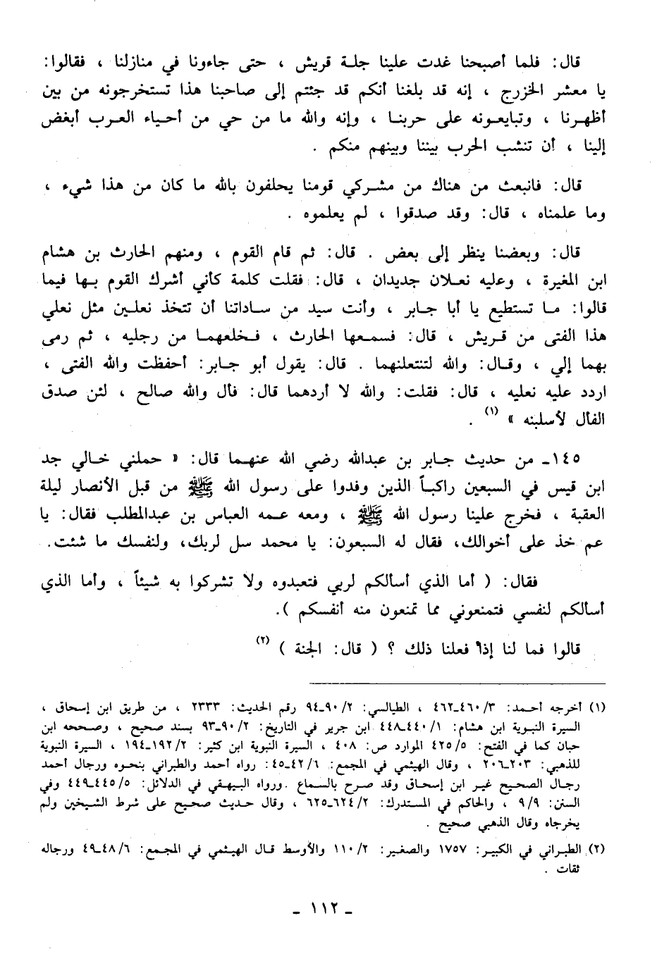145 - من حديث جابر بن عبد الله رضي الله عنهما قال: "حملني خالي جد ابن قيس في السبعين راكبًا الذين وفدوا على رسول الله - صلى الله عليه وسلم - من قبل الأنصار ليلة العقبة، فخرج علينا رسول الله - صلى الله عليه وسلم -، ومعه عمه العباس بن عبد المطلب فقال: يا عم خذ على أخوالك، فقال له السبعون: يا محمَّد سل لربك، ولنفسك ما شئت.