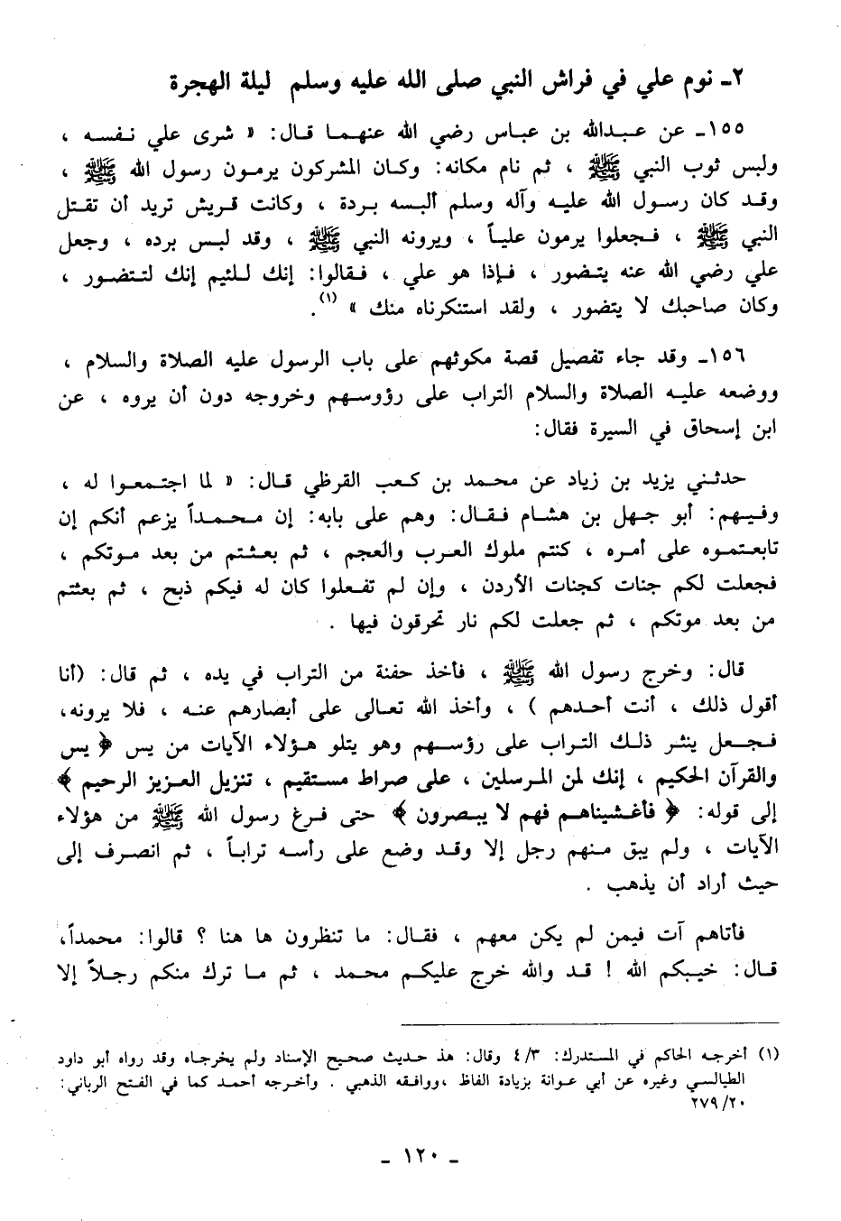155 - عن عبد الله بن عباس رضي الله عنهما قال: "شرى علي نفسه، ولبس ثوب النبي - صلى الله عليه وسلم -، ثم نام مكانه: وكان المشركون يرمون رسول الله - صلى الله عليه وسلم -، وقد كان رسول الله عليه وآله وسلم ألبسه بردة، وكانت قريش تريد أن تقتل النبي - صلى الله عليه وسلم -، فجعلوا يرمون عليًّا، ويرونه النبي - صلى الله عليه وسلم -، وقد لبس برده، وجعل علي رضي الله عنه يتضور، فهذا هو علي، فقالوا: إنك للئيم إنك لتتضور، وكان صاحبك لا يتضور، ولقد استنكرناه منك" (¬1).