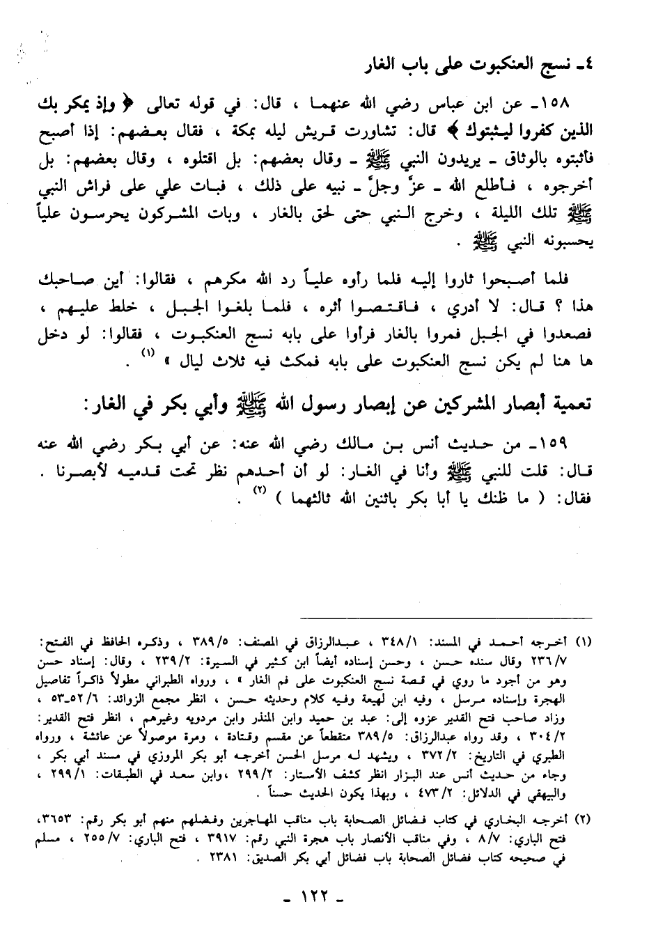 158 - عن ابن عباس رضي الله عنهما، قال: في قوله تعالى {وَإِذْ يَمْكُرُ بِكَ الَّذِينَ كَفَرُوا لِيُثْبِتُوكَ} قال: تشاورت قريش ليله بمكة، فقال بعضهم: إذا أصبح فأثبتوه بالوثاق -يريدون النبي - صلى الله عليه وسلم - وقال بعضهم: بل اقتلوه، وقال بعضهم: بل أخرجوه، فأطلع الله -عَزَّ وَجَلَّ- نبيه على ذلك، فبات علي على فراش النبي - صلى الله عليه وسلم - تلك الليلة، وخرج النبي حتى لحق بالغار, وبات المشركون يحرسون عليًّا يحسبونه النبي - صلى الله عليه وسلم -.