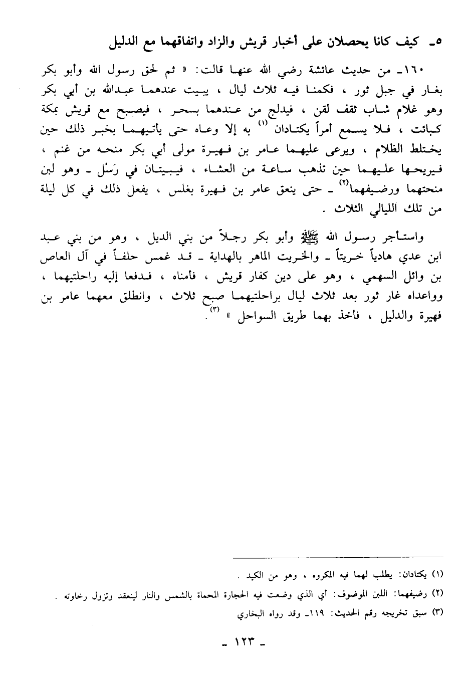 160 - من حديث عائشة رضي الله عنها قالت: (ثم لحق رسول الله وأبو بكر بغار في جبل ثور، ممم فأقمنا أو فمكثنا ممم فكمنا فيه ثلاث ليال، يبيت عندهما عبد الله بن أبي بكر وهو غلام شاب ثقف لقن، فيدلج من عندهما بسحر، فيصبح مع قريش بمكة كبائت، فلا يسمع أمرًا يكتادان (¬1) به إلا وسماه حتى يأتيهما بخبر ذلك حين يختلط الظلام، ويرعى عليهما عامر بن فهيرة مولى أبي بكر منحه من غنم، فيريحها عليهما حين تذهب ساعة من العشاء، فيبيتان في رَسْل -وهو لبن منحتهما ورضيفهما (¬2) - حتى ينعق عامر بن فهيرة بغلس، يفعل ذلك في كل ليلة من تلك الليالي الثلاث.