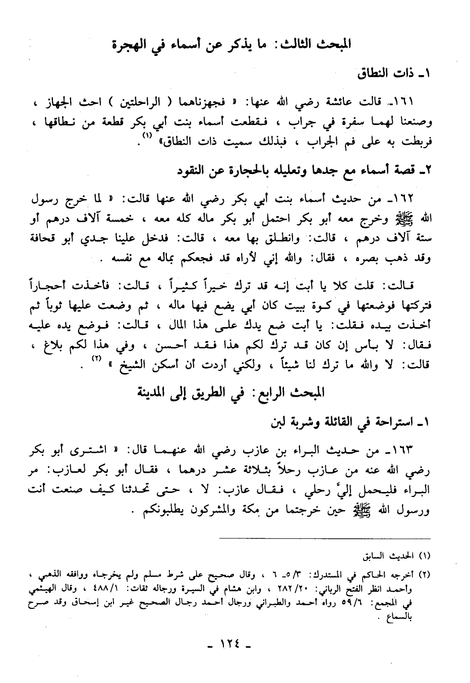 162 - من حديث أسماء بنت أبي بكر رضي الله عنها قالت: "لما خرج رسول الله - صلى الله عليه وسلم - وخرج معه أبو بكر احتمل أبو بكر ماله كله معه، خمسة آلاف درهم أو ستة آلاف درهم، قالت: وانطلق بها معه، قالت: فدخل علينا جدي أبو قحافة وقد ذهب بصره، فقال: والله إني لأراه قد فجعكم بماله مع نفسه.