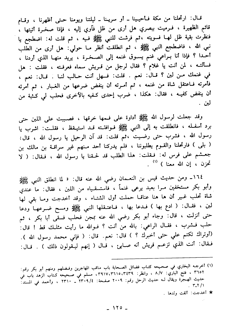164 - ومن حديث قيس بن النعمان رضي الله عنه قال: "لما انطلق النبي - صلى الله عليه وسلم - وأبو بكر مستخفين مرا بعبد يرعى غنمًا، فاستسقياه من اللبن، فقال: ما عندي شاة تحلب غير أن ها هنا عناقا حملت أول الشتاء، وقد أخدجت وما بقي لها لبن، فقال: (ادع بها) فدعا بها، فاعتقلها النبي - صلى الله عليه وسلم - ومسح ضرعها ودعا حتى أنزلت، قال: وجاء أبو بكر رضي الله عنه بمجن فحلب فسقى أبا بكر، ثم حلب فشرب، فقال الراعي: بالله من أنت؟ فوالله ما رأيت مثلك قط! قال: (أوتراك تكتم علي حتى أخبرك؟) قال: نعم. قال: (فإني محمَّد رسول الله). فقال: أنت الذي تزعم قريش أنه صابئ، قال (إنهم ليقولون ذلك). قال: