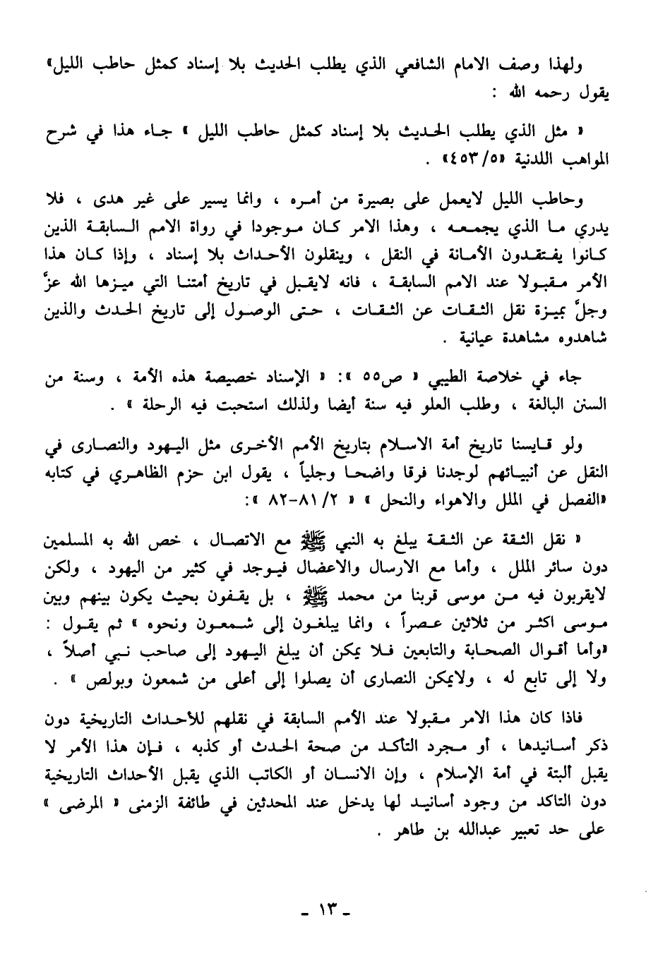 "نقل الثقة عن الثقة يبلغ به النبي - صلى الله عليه وسلم - مع الاتصال، خص الله به المسلمين دون سائر الملل، وأما مع الإرسال والإعضال فيوجد في كثير من اليهود، ولكن لا يقربون فيه من موسى قربنا من محمد - صلى الله عليه وسلم -، بل يقفون بحيث يكون بينهم وبين موسى أكثر من ثلاثين عصرًا، وإنما يبلغون إلى شمعون ونحوه" ثم يقول: "وأما أقوال الصحابة والتابعين فلا يمكن أن يبلغ اليهود إلى صاحب نبي أصلًا، ولا إلى تابع له، ولا يمكن النصارى أن يصلوا إلى أعلى من شمعون وبولص".
