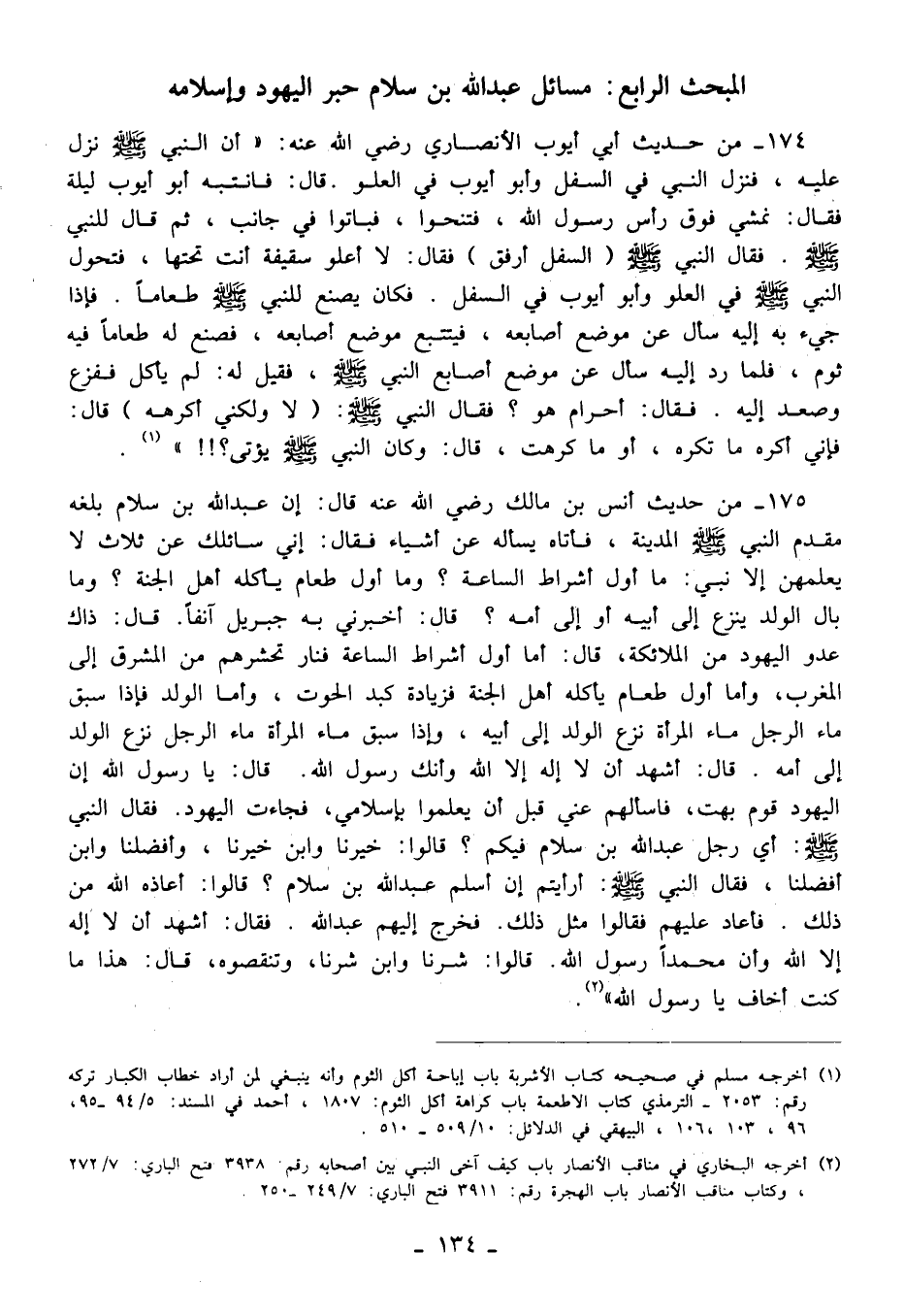 175 - من حديث أنس بن مالك رضي الله عنه قال: إن عبد الله بن سلام بلغه مقدم النبي - صلى الله عليه وسلم - المدينة، فأتاه يسأله عن أشياء فقال: إني سائلك عن ثلاث لا يعلمهن إلا نبي: ما أول أشراط الساعة؟ وما أول طعام يأكله أهل الجنة؟ وما بال الولد ينزع إلى أبيه أو إلى أمه؟ قال: أخبرني به جبريل آنفًا. قال: ذاك عدو اليهود من الملائكة، قال: أما أول أشراط الساعة فنار تحشرهم من المشرق إلى المغرب، وأما أول طعام يأكله أهل الجنة فزيادة كبد الحوت، وأما الولد فإذا سبق ماء الرجل ماء المرأة نزع الولد إلى أبيه، وإذا سبق ماء المرأة ماء الرجل نزع الولد إلى أمه. قال: أشهد أن لا إله إلا الله وأنك رسول الله. قال: يا رسول الله إن اليهود قوم بهت، فاسألهم عني قبل أن يعلموا بإِسلامي، فجاءت اليهود. فقال النبي - صلى الله عليه وسلم -: أي رجل عبد الله بن سلام فيكم؟ قالوا: خيرنا وابن خيرنا، وأفضلنا وابن أفضلنا، فقال النبي - صلى الله عليه وسلم -: أرأيتم إن أسلم عبد الله بن سلام؟ قالوا: أعاذه الله من ذلك. فأعاد عليهم فقالوا مثل ذلك. فخرج إليهم عبد الله. فقال: أشهد أن لا إله إلا الله وأن محمدًا رسول الله. قالوا: شرنا وابن شرنا، وتنقصوه، قال: هذا ما كنت أخاف يا رسول الله" (¬2).