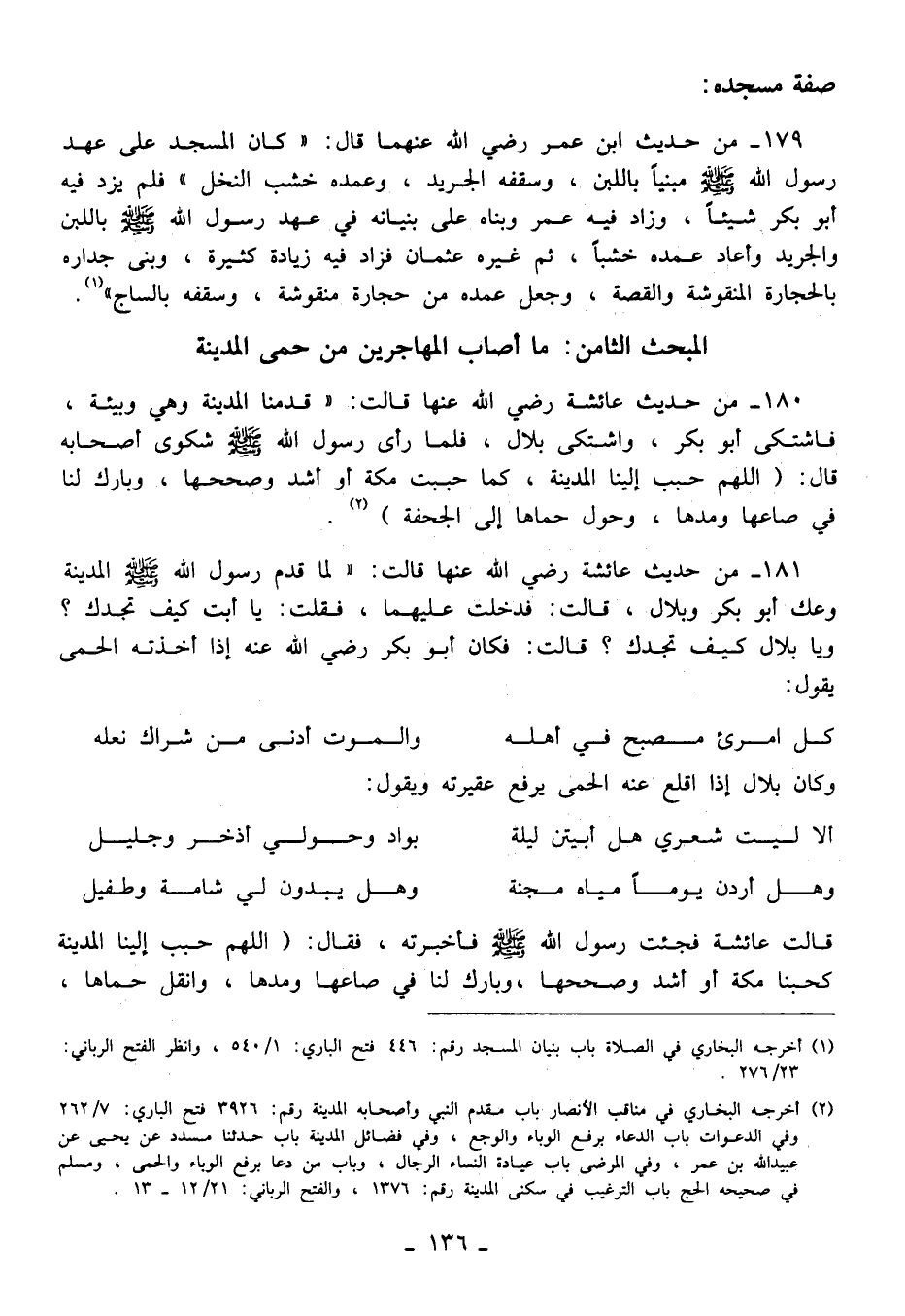 180 - من حديث عائشة رضي الله عنها قالت: "قدمنا المدينة وهي وبيئة، فاشتكى أبو بكر، واشتكى بلال، فلما رأى رسول الله - صلى الله عليه وسلم - شكوى أصحابه قال: (اللهم حبب إلينا المدينة، كما حببت مكة أو أشد وصححها، وبارك لنا في صاعها ومدها، وحول حماها إلى الجحفة) (¬2).