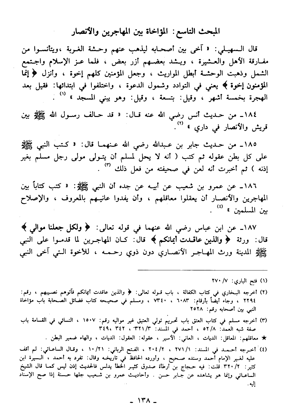 187 - عن ابن عباس رضي الله عنهما في قوله تعالى: {وَلِكُلٍّ جَعَلْنَا مَوَالِيَ} قال: ورثة {وَالَّذِينَ عَقَدَتْ أَيْمَانُكُمْ} قال: كان المهاجرين لما قدموا على النبي - صلى الله عليه وسلم - المدينة ورث المهاجر الأنصاري دون ذوي رحمه، للأخوة التي آخى النبي