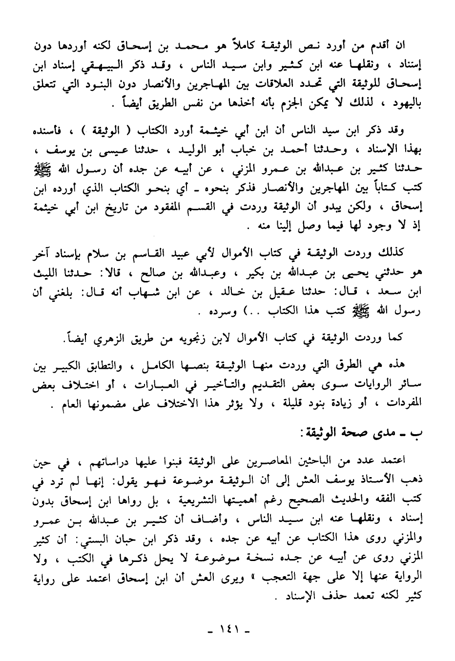 أن أقدم من أورد نص الوثيقة كاملًا هو محمَّد بن إسحاق لكنه أوردها دون إسناد، ونقلها عنه ابن كثير وابن سيد الناس، وقد ذكر البيهقي إسناد ابن إسحاق للوثيقة التي تحدد العلاقات بين المهاجرين والأنصار دون البنود التي تتعلق باليهود، لذلك لا يمكن الجزم بأنه أخذها من نفس الطريق أيضًا.
