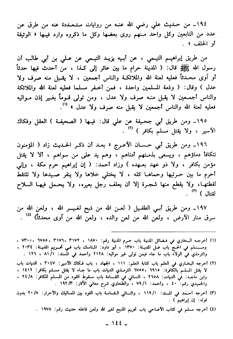 196 - ومن طريق أبي حسان الأعرج "بعد أن ذكر الحديث زاد (المؤمنون تتكافأ دماؤهم، ويسعى بذمتهم أدناهم، وهم يد على من سواهم، ألا لا يقتل مؤمن بكافر، ولا ذو عهد بعهده) وزاد أحمد: (إن إبراهيم حرم مكة؛ وإني أحرم ما بين حرتيها وحماها كله، لا يختلي خلاها ولا ينفر صيدها ولا تلتقط لقطتها, ولا يقطع منها شجرة إلا أن يعلف رجل بعيره، ولا يحمل فيها السلاح لقتال) (¬3).