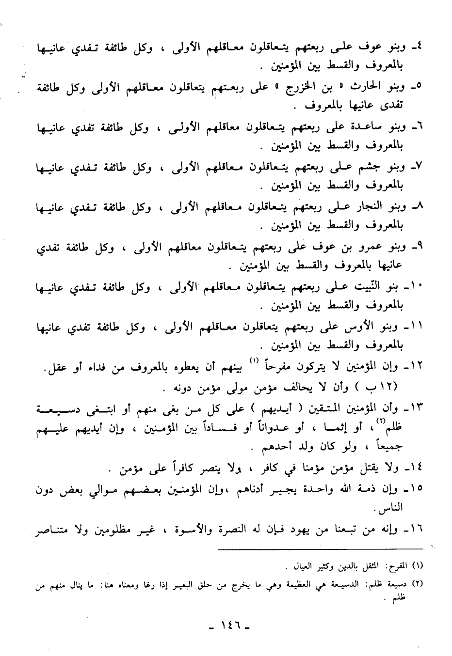5 - وبنو الحارث "بن الخزرج" على ربعتهم يتعاقلون معاقلهم الأولى وكل طائفة تفدى عانيها بالمعروف.
