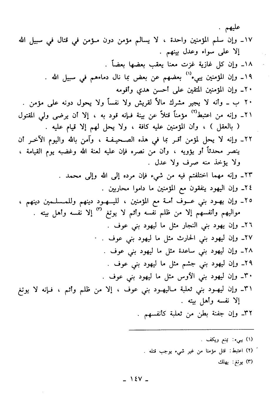 25 - وإن يهود بني عوف أمة مع المؤمنين، لليهود دينهم وللمسلمن دينهم، مواليهم وأنفسهم إلا من ظلم نفسه وأثم لا يوتغ (¬3) إلا نفسه وأهل بيته.