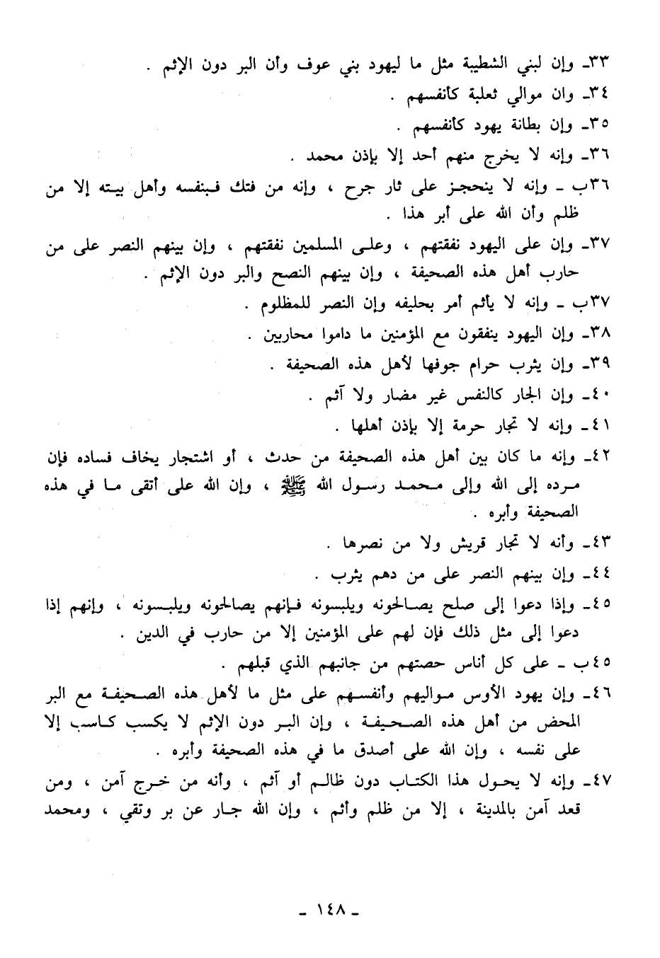 46 - وإن يهود الأوس مواليهم وأنفسهم على مثل ما لأهل هذه الصحيفة مع البر المحض من أهل هذه الصحيفة، وإن البر دون الإثم لا يكسب كاسب إلا على نفسه، وإن الله على أصدق ما في هذه الصحيفة وأبره.